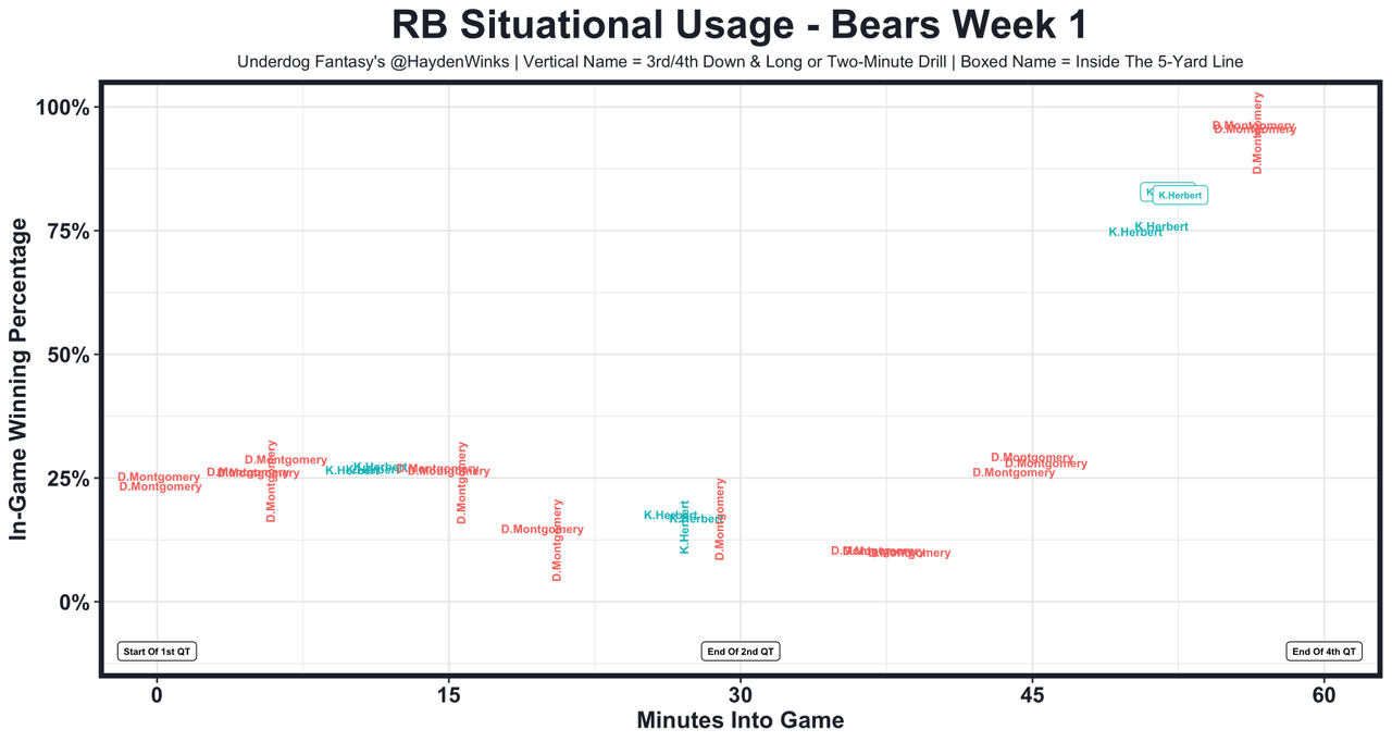 David Montgomery - 65% of RB carries (17), 24% total targets (4), and 70% routes for the Bears' mini bellcow in Week 1. Ignore the goal-line stats, as Khalil Herbert was playing the drive that resulted in all goal-line opportunities. It looks like the Bears will give Montgomery the first two drives, with Herbert getting the next one and so on. That's enough for low-end RB2 production.