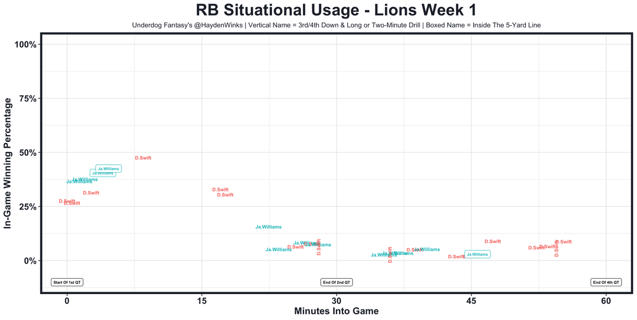 D'Andre Swift (Questionable) - Rapoport reports Swift will play but the Lions "may have to be selective about his usage". This ranking reflects some initial concern. Let's see if we get any more clarity from other reporters. ... Explosive dual-threat player behind a kick-ass OL is a great start. Primary concern are goal-line touches and general reliability. Swift was subbed out at the 5-yard line leading to Jamaal Williams' first score and then subbed out at the 2-yard line after a sweet catch for Williams' second score. He also missed a couple blitz pick-ups on passing downs. These clear pros and cons are similar to last year, except the team is simply better.
