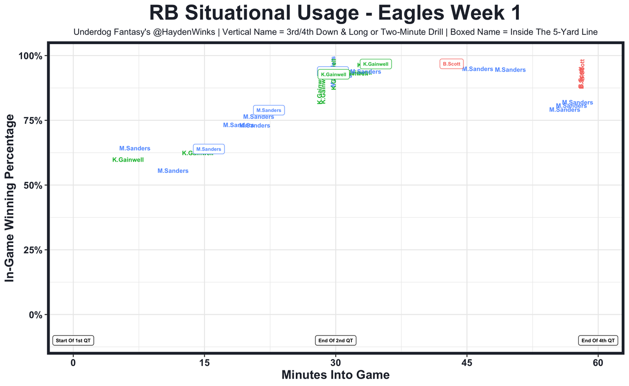 Miles Sanders - He's the top option in a 3-RB committee. Sanders isn't viewed as a complete player by this coaching staff, as he was subbed out in the 2-minute drill (Kenny Gainwell) and in the 4th quarter while running out the clock only up 3 points in clear rushing spots (Boston Scott). All three saw goal-line carries whenever their drive happened to reach the red area, too. In total, 13.1 expected fantasy points and 51% snaps behind this OL is just enough for RB2/3 status.