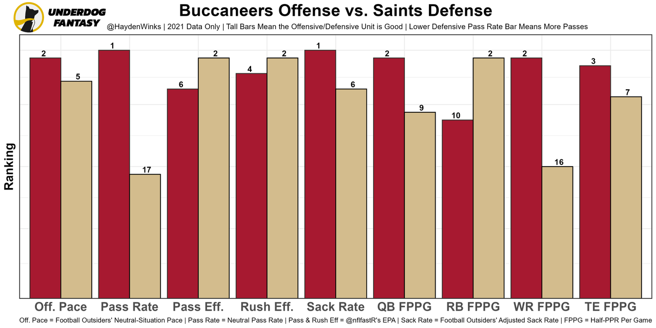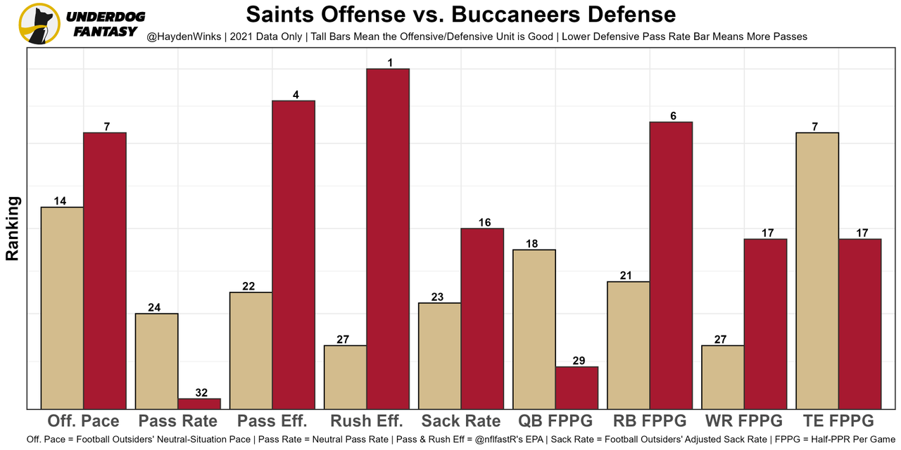 Brady's splits against the Saints are bad, but since then, they've lost Chauncey Gardner-Johnson, Marcus Williams, and Malcolm Jenkins in the secondary, which could limit the Saints' defensive aggressiveness and success in general. On tape last week, Brady was aggressive downfield and still had plenty of arm strength to the sideline, but it was interesting to see the Bucs rank 28th in neutral pass rate after finishing top-5 in each of his previous Bucs seasons. That won't completely continue, but it's possible there's a philosophy change from coach Bruce Arians to coach Todd Bowles and with the OL looking much worse, especially with LT Donovan Smith (elbow) doubtful. For now, the Bucs have a mediocre 23.25-point team total.