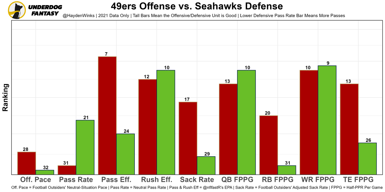 Dead last in neutral pass rate (26%), it's obvious how run-heavy Kyle Shanahan will make this offense with Lance at QB (and I don't think the rain explains all of that because it really came down in the 4th quarter primarily). He missed a couple of throws because of accuracy and a couple others because he wasn't seeing the field, but Lance also layered in a few intermediate and deep throws. There will be ups-and-downs, especially if George Kittle (groin) misses again. The Seahawks will be able to rush the passer against the 49ers' troubling OL (aside from LT Trent Williams), so I'm surprised to see San Francisco with the 8th-highest team total of Week 2. Expect a lot of gadget-work from Deebo Samuel in the backfield with Eli Mitchell (knee) out.