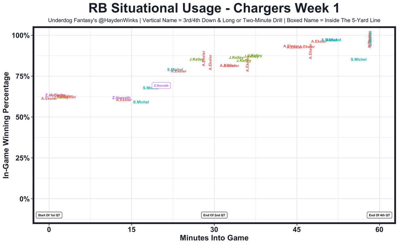 Austin Ekeler - Week 1 went as bad as it gets. Ekeler rotated (49% snaps) with Joshua Kelley (27%) and Sony Michel (23%), also only running a route on 37% of Herbert's dropbacks. This comes after publicly saying that he wants another RB to step up. Ekeler still was the goal-line back and could go crazy in negative game scripts, especially this week against the Chiefs with Keenan Allen out. If Ekeler doesn't rebound to 65% or higher snaps this week, it's time to get really nervous. His Underdog Fantasy Pick'em projection is set for 97.5 total yards.