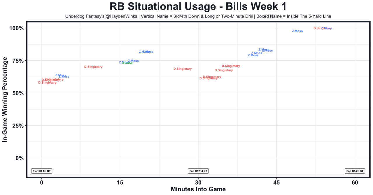 Devin Singletary - He, Zack Moss (fumble), and James Cook (fumble) all played in what was mostly a series-by-series basis, rather than a particular role. There weren't any goal-line opportunities or passing-down targets to the RBs, but if Cook isn't in the rookie dog house, then it'll be hard to generate ceiling for Singletary even if he's the top guy in Buffalo. On tape, it's clear that Moss has the least juice but has the most girth.