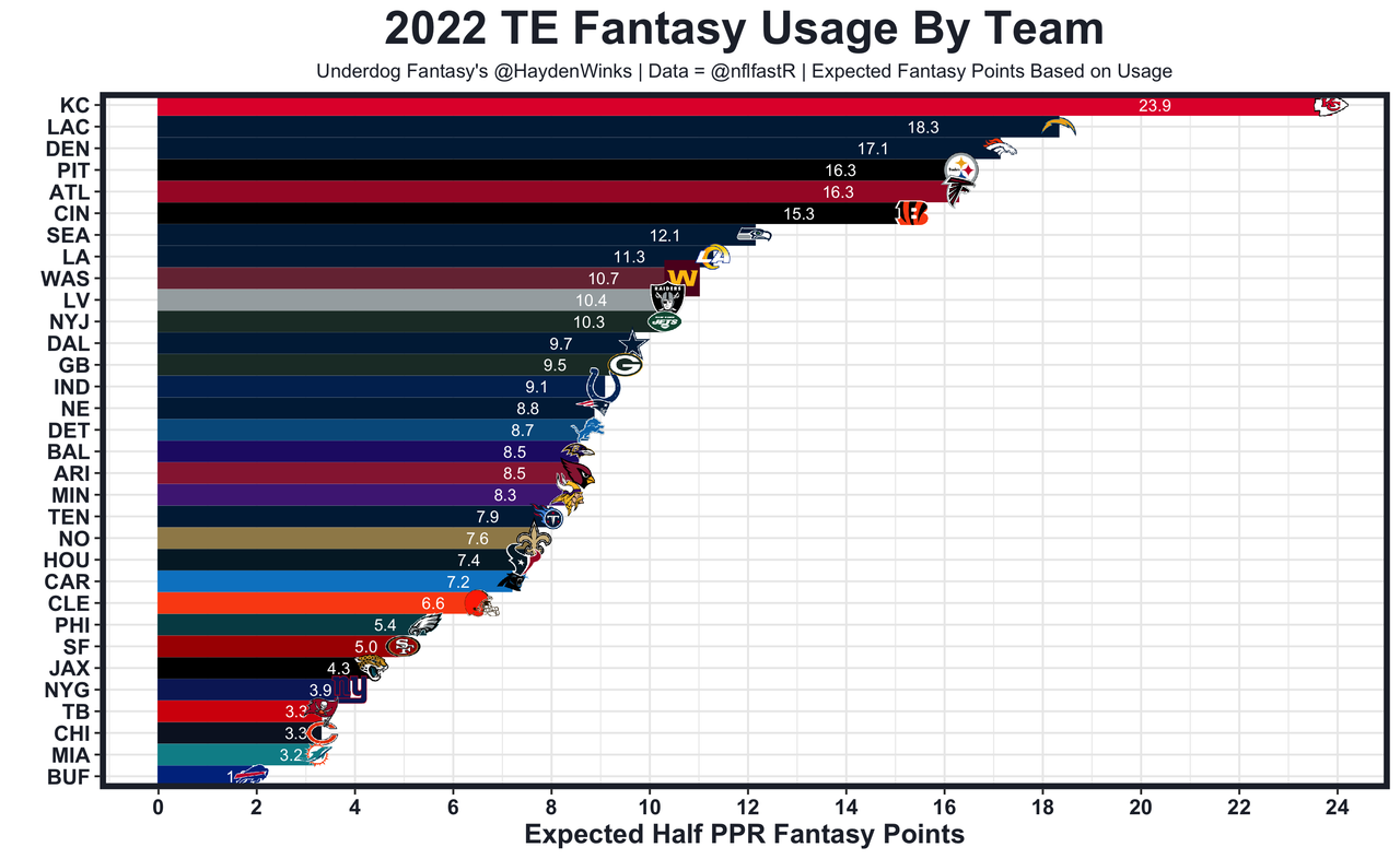Tyler Higbee - 92% routes and 9.5 expected half PPR points per game (TE4) in Week 1 while trailing all game. Those metrics alone make him a top-12 TE.