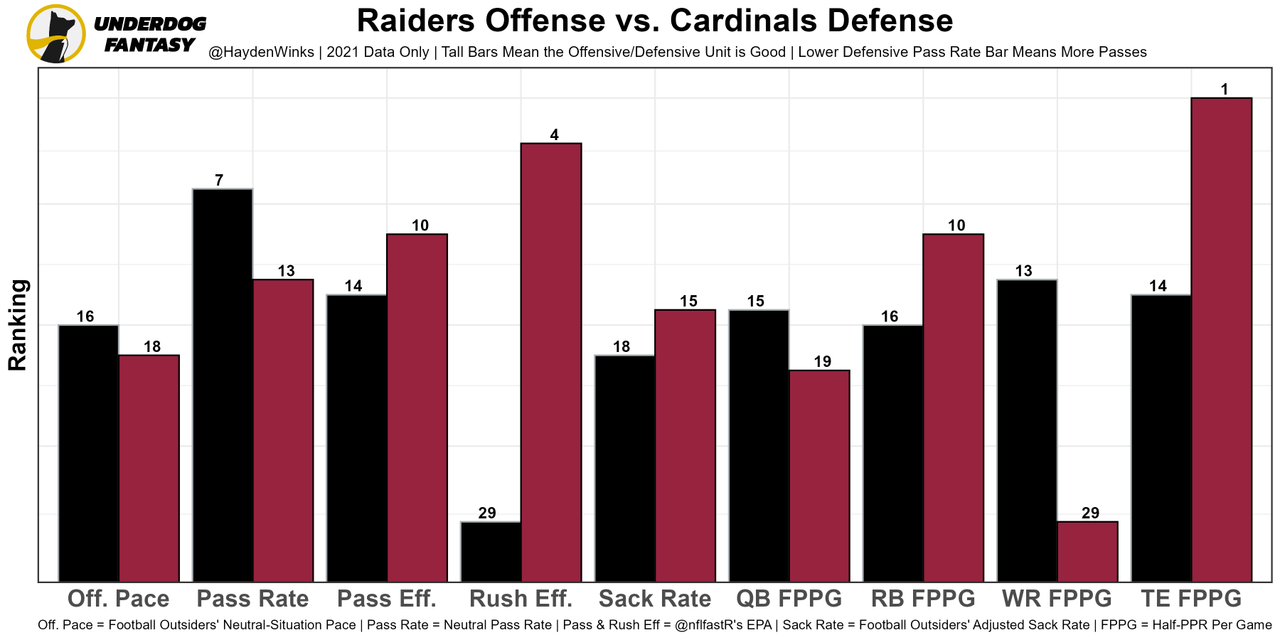 The Cardinals defense is missing FS Jalen Thompson, CB Trayvon Mullen, and potentially EDGE J.J. Watt, and their aggressive blitz/man defense needs coverage skills to win. Carr is firmly a QB1 with Vegas projected for 28.5 points.