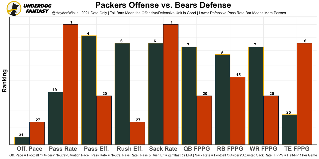 Allen Lazard returning is a big deal because Aaron Rodgers simply didn't trust Christian Watson or Romeo Doubs last week, while Sammy Watkins and Randall Cobb look dusty in general. Rodgers also could be without LT David Bakhtiari (DNP Thursday), RT Elgton Jenkins (limited Thursday), and G Jon Runyan (DNP Thursday) up front. The matchup is mediocre in general; Chicago plays slow offensive and their defense has enough players up the middle to hold up. Rodgers will continue to lean on his RBs to move the ball, making it harder to create big plays. I was surprised to see the Packers projected for 26.5 points this week.