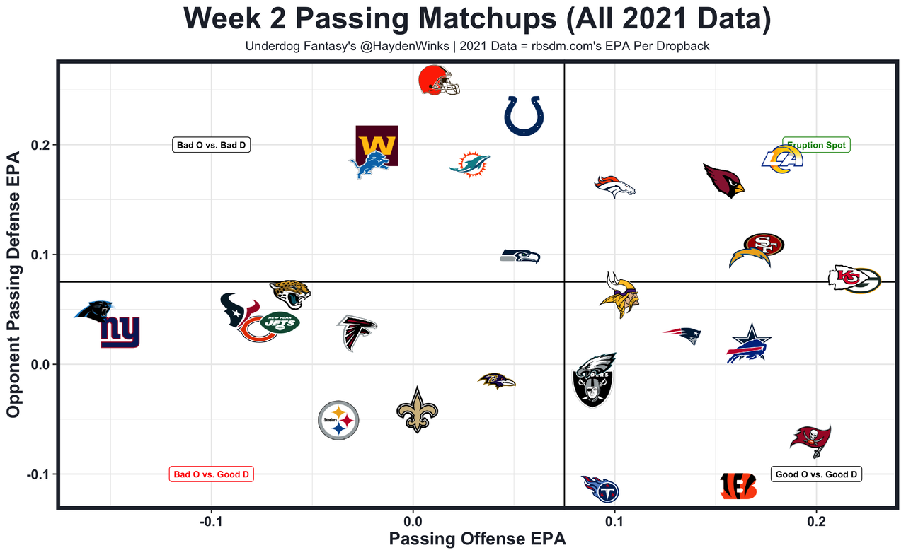 The Ravens were 3rd in neutral pass rate in the opener and remain iffy at RB with J.K. Dobbins still on the injury report. Jackson went big-play hunting with the highest aDOT (12.0 yards downfield) last week, and the Dolphins defense was in single-high shells at the 2nd highest rate last week. Without their CB2, Jackson should have opportunities for downfield shots, especially if LT Ronnie Stanley (limited Wednesday) can suit up. Baltimore is 14th in projected points.