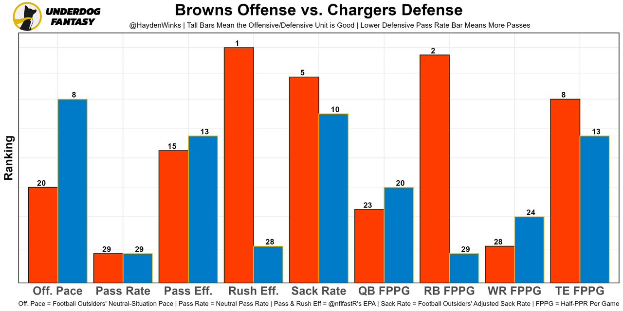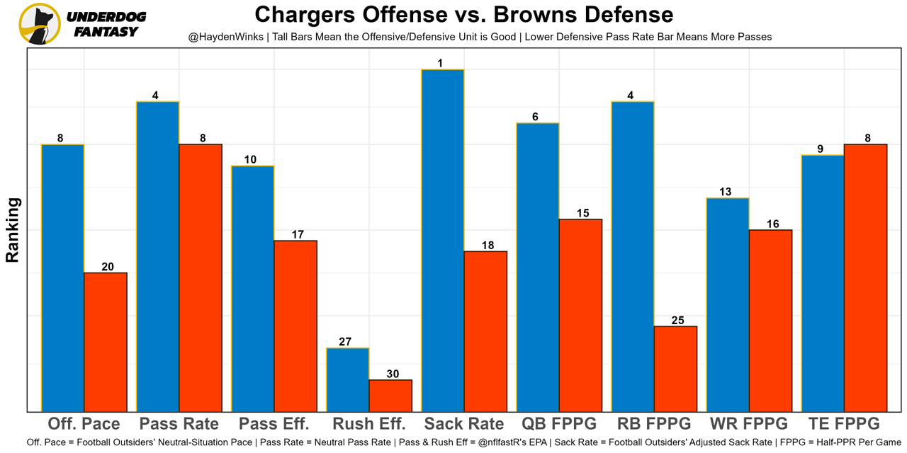 The Chargers might have something in 3rd-string rookie LT Jamaree Salyer, but he'll be challenged by Myles Garrett this week. We'll learn more about how the Chargers OL can hold up this week in a tougher matchup. Even if it's bad, I'm betting on Herbert just figuring it out. Cleveland's defense has miscommunication issues in the back half all year. It's worth monitoring the skill player options here, too. Keenan Allen (DNPx), Gerald Everett, and Josh Palmer are all banged up.