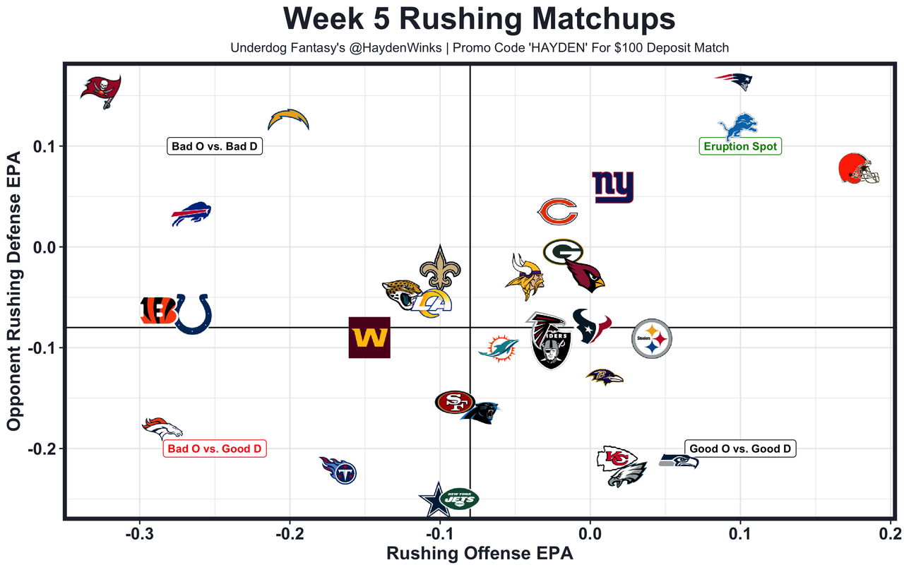 The matchup is difficult on paper -- the efficiency likely won't be great -- but there are some positives deep in here. Offenses facing the Eagles have chose to pass at the 2nd highest rate, and the Eagles own offense is 4th in neutral pace. Kyler should have a bunch of pass attempts at home as 5.5-point underdogs.