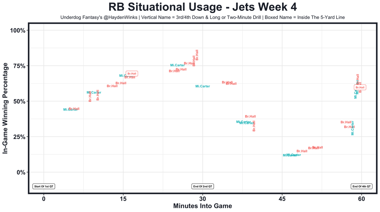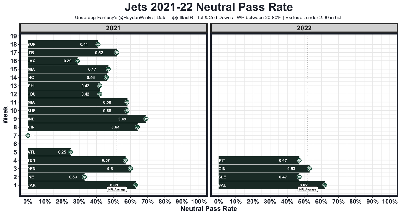 We discussed him here, with all-22 film. In short, he looked better than usual but still had too many negative plays behind a very iffy OL. The matchup this week is straightforward. Miami will bring the house with a banged up secondary, allowing the Jets WRs to have one-on-one matchups. If Wilson can handle the pressure, he'll be fine. If he can't, this will be a long day. The betting markets have the Jets 22nd in implied team total. Lastly, the Jets have had a lower neutral pass rate in all Wilson starts compared to Flacco/White Guy starts (see above). It's something to monitor.