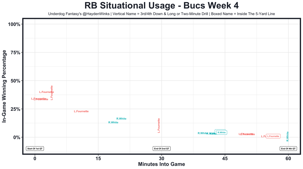 9. Leonard Fournette - For the first time, the Bucs used Rachaad White in non-garbage time in a sorta 2-for-1 drive rotation. This was necessary as the Bucs are dead last in rushing EPA and White provides a completely different skillset on the perimeter. What's extremely bullish for White long-term is that the Bucs are already comfortable using him in all situations, not just in a particular role. He played passing downs and scored a goal-line TD last week. For now, Fournette still projects well, but make sure White is rostered everywhere. He could be a late-season league winner.