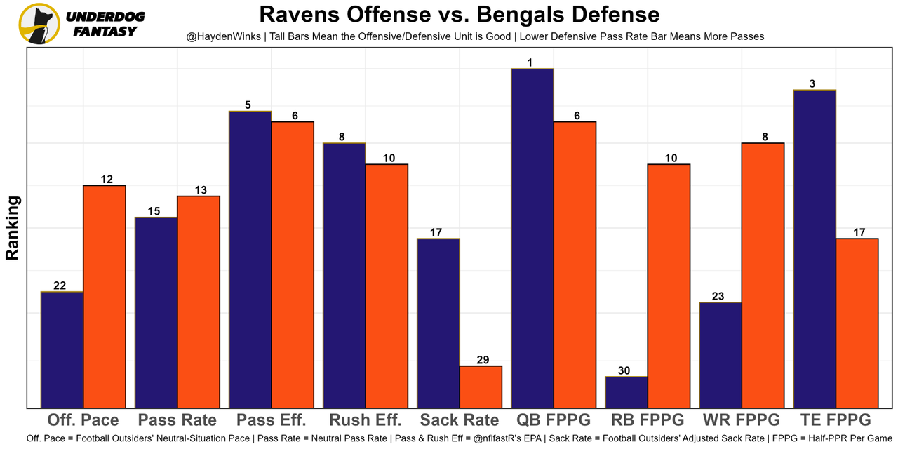 Offenses facing the Ravens are choosing to pass in neutral situations at the 3rd-highest rate in the NFL, and it's lead to allowing the most fantasy points to opposing QBs. I don't understand why the Bengals' team total only sits at 22.75 points. I'm betting against that low-ish projection with this Burrow ranking.