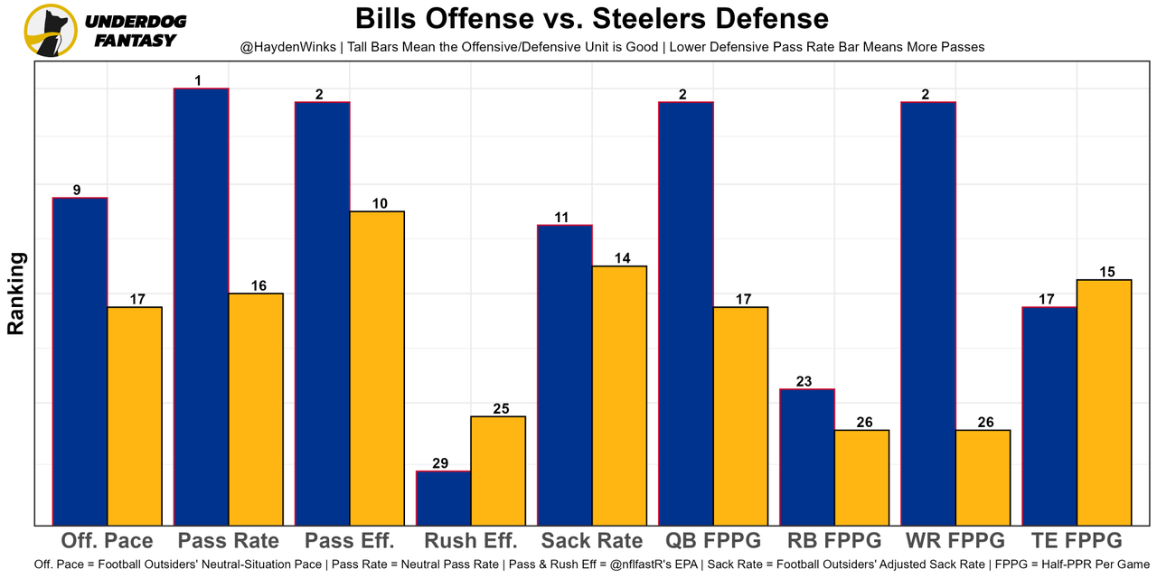 Without T.J. Watt, the Steelers have been a league average defense. It's no surprise to see the Bills with the highest projected team total. Stacking Josh Allen this week will be come down to availability. Jamison Crowder (IR), Jake Kumerow (week-to-week), Isaiah McKenzie (concussion protocol), Gabe Davis (ankle), and Dawson Knox (foot/hamstring) are all dealing with something.