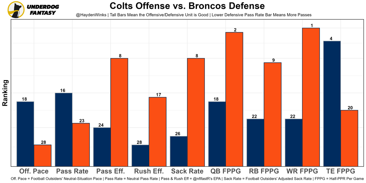The Colts' No. 18 neutral pace and No. 16 neutral pass rate will climb with Nyheim Hines swapping in for Jonathan Taylor at RB. The bad news is Ryan looks as bad as ever behind a surprisingly weak OL (No. 26 in adjusted sack rate). It's a bad time to be facing a top-5 defense on the road on Thursday Night Football. Broncos CB1 Pat Surtain might be the best coverage corner in the NFL already.