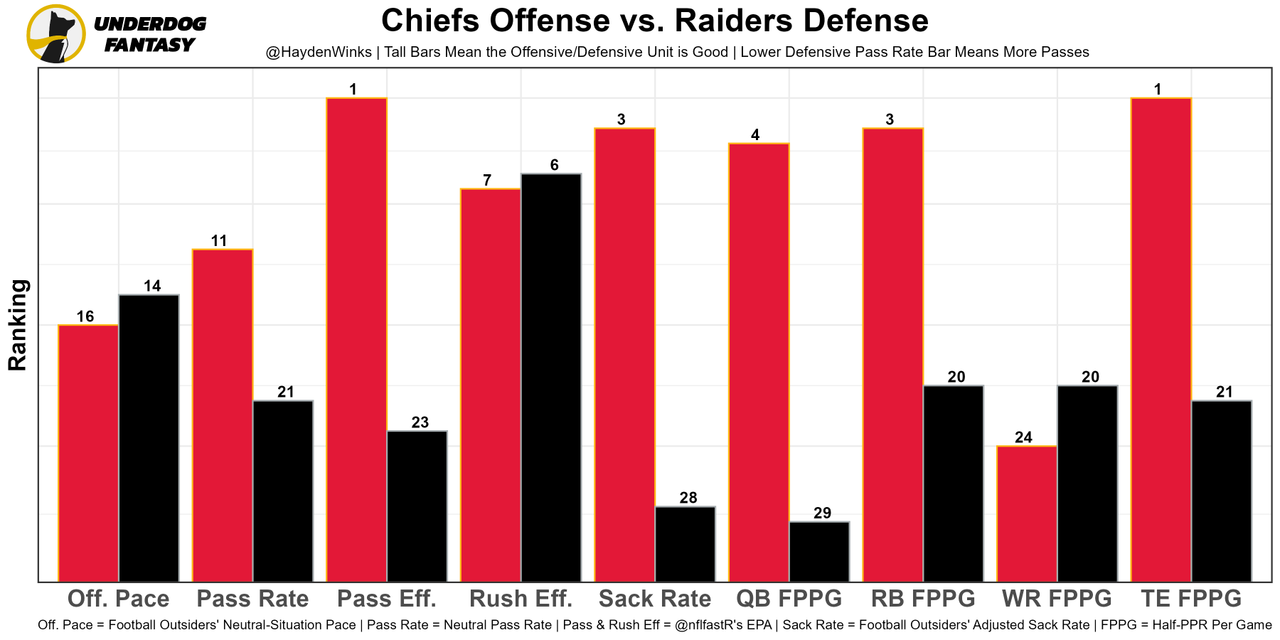 Offenses facing the Chiefs are choosing to pass at the highest rate in the NFL, leading Kansas City's defense to No. 27 against fantasy QBs. We should expect the Raiders offense to get better month-after-month in a notoriously difficult Josh McDaniels' scheme. I like Carr's chances in projected garbage time as 7-point road dogs.