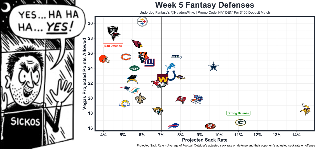 The defenses of the week are the Vikings, Packers, 49ers, and Bills, with the Titans, Broncos, Bucs, Jaguars, and Cowboys all in play, too.