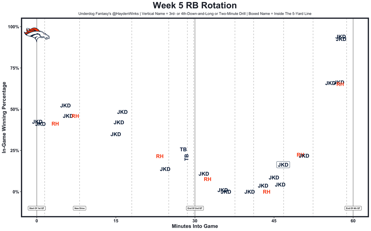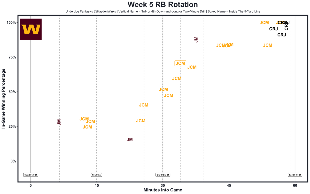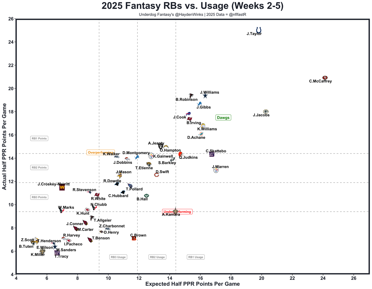 The Commanders are 3rd in projected points (27.25), and it's an eruption spot per the rushing EPA chart with the Bears ranking 31st in average tackle depth on RB carries. More importantly, Week 5 was a firm changing of the guard. Bill started the game, was the clear early-down favorite, and only lost snaps to Chris Rodriguez in full-blown garbage time. That led to 11.3 expected half PPR points and two real-life scores on the perimeter. He hasn't taken the pass-game work from Jeremy McNicols yet, but Bill doesn't need them to be an upside RB2 in good matchups. He's been highly efficient on the ground in a complex rushing scheme. His patience and decision-making have been even more impressive than his burst.