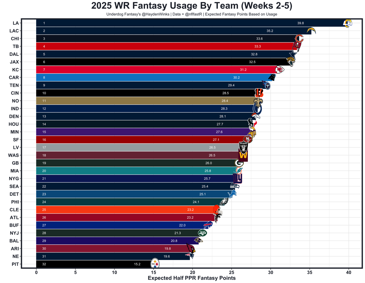 Terry McLaurin isn't expected back, and the Commanders are 3rd in projected points (27.0) as hosts to the porous Bears secondary. They've been lit up by slot receivers while SCB Kyler Gordon dealt with injuries earlier on, but even with him back, this is an elite spot. Deebo is the WR12 on WR18 usage this month despite not having Jayden Daniels the entire time. He's averaging 13.8 expected half PPR points without McLaurin versus 9.7 with him in the lineup.