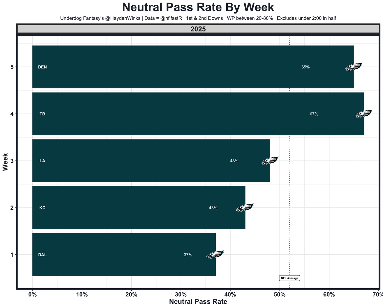 The Eagles yards before contact per carry on RB carries has dropped from 1st to 16th this year. There's clear reasons beyond Saquon himself. LG Landon Dickerson had a back injury and now his ankle has him sidelined weeks, C Cam Jurgens just said he's not fully healthy after back surgery, and RG Tyler Steen was a backup last year. The Eagles are now shifting away from a run-based team towards a legit pass-first team, so Barkley will have fewer opportuties to rip off his signature big plays. The good news is this is a an eruption spot per the rushing EPA chart, and it's a revenge game vs. the Giants.