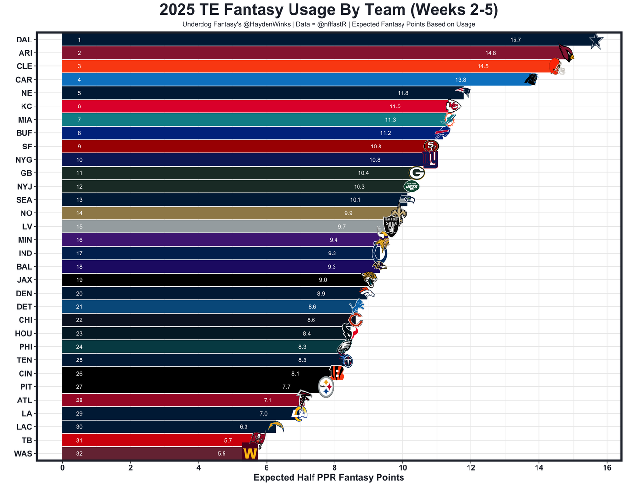 A monster of a man, Johnson is turning into a real first-target player without Malik Nabers. Last week, Johnson had two bubble screens plus two end zone targets as the isolated receiver in 3x1 sets. That's rare at the position. The Jaxson Dart offense will be RPO-heavy, and that means these bubbles and quick slants are on the menu. The matchup with the Eagles is extremely difficult, but keep an eye out here. He's an elite athlete with no target competition. He's the TE14 on TE7 usage this month, but that's 11.4 expected half PPR points over the past two weeks without Nabers (TE3 usage).