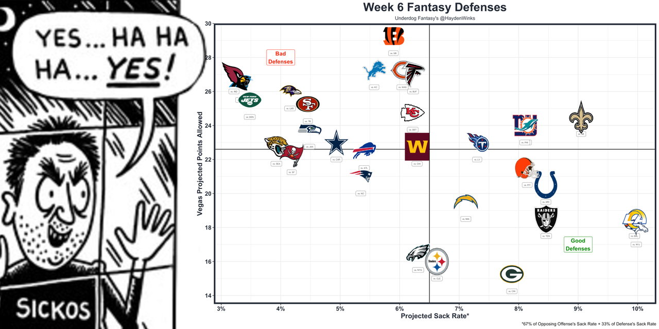 The Commanders have the 4th-most projected points (27.0) vs. CHI, who may not have S Jaquan Brisker and DT Grady Jarrett in addition to CB1 Jaylon Johnson on injured reserve. The Bears are 6th in fantasy points allowed, even allowing J.J. McCarthy to pop up for 22.2 points.