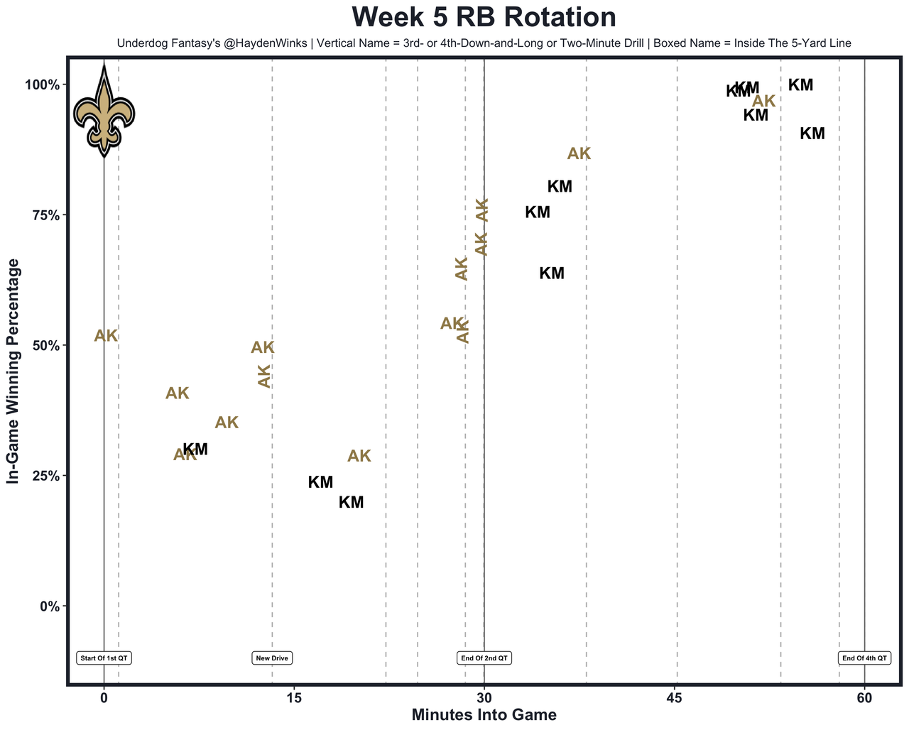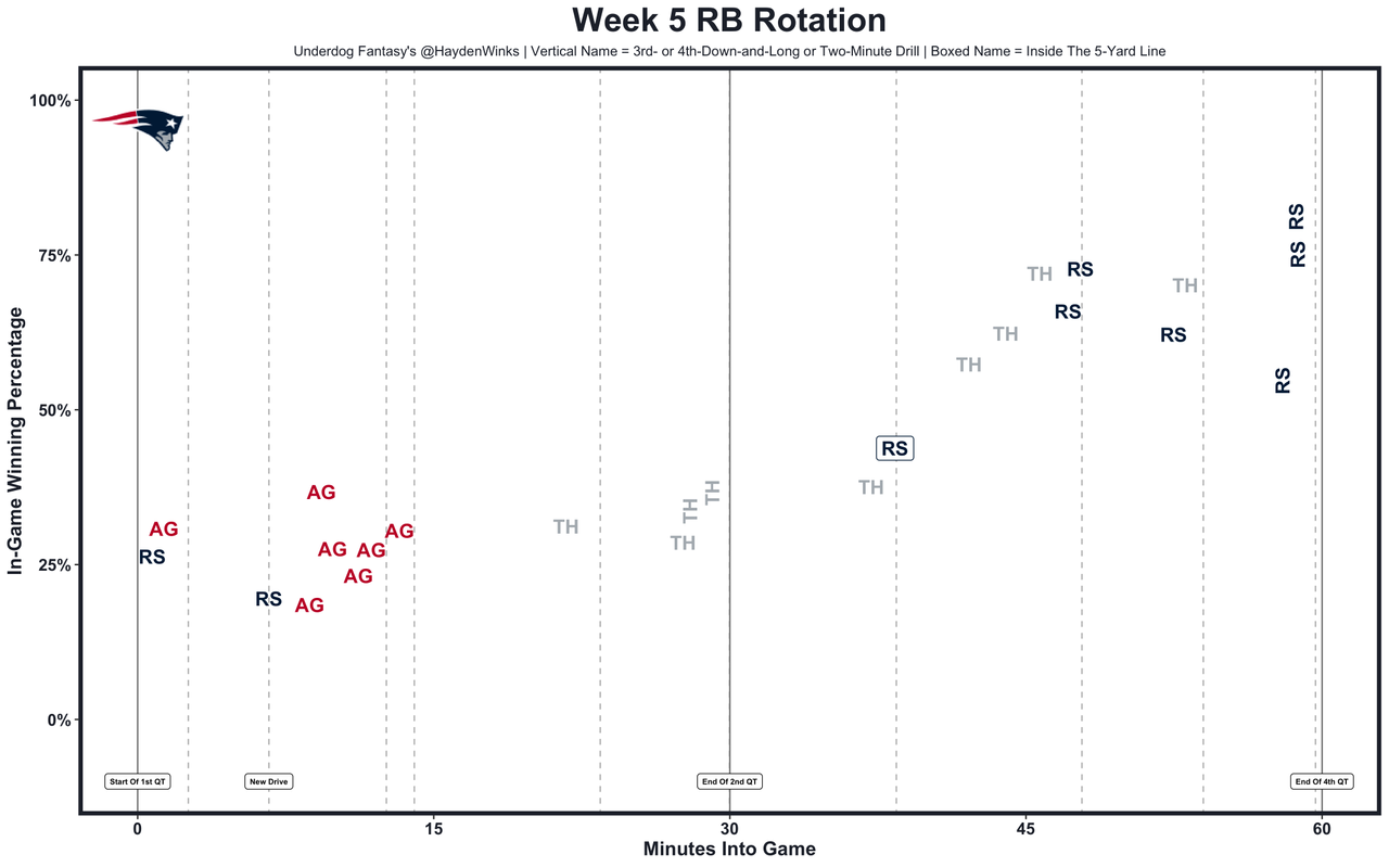 In the last 2 games with Stefon Diggs ramped up, Henry is averaging just 6.6 expected half PPR points, where it was 12.7 expected half PPR points in the first 3 games as the clear focal point. The good news is the Patriots' above-average 24.5-point team total vs. the Saints.