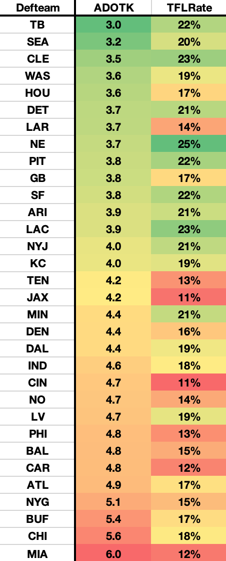 The Lions are 10th in projected points (24.75), which is a bit lower than normal, but it's an eruption spot per the rushing EPA chart. The Chiefs have struggled against RBs (4.9 YPC) and are on short rest here. When teams have been in neutral and positive situations, then they can pound it on Kansas City. This is an underrated solid spot for Montgomery, who is the RB16 on RB20 usage this month. He had an outlier usage game last week with his sister in town. Love a good narrative.