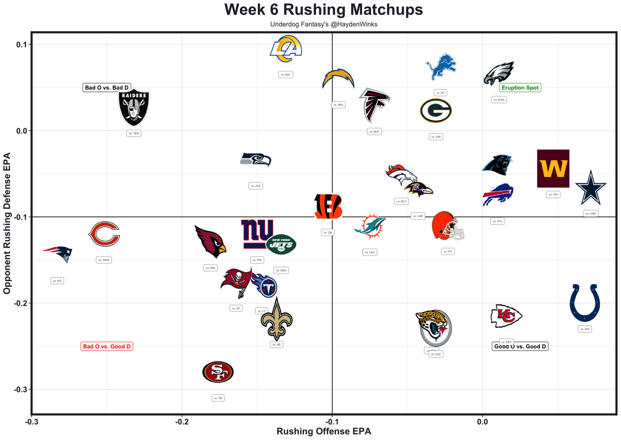 He's the RB6 on RB2 usage this month and had a monster game before the bye. Hopefully the Packers get back some OL starters after the bye, but even without them, Jacobs has survived. Now Green Bay has a 29.25-point team total (1st) as a 14-point home favorite against the Bengals. It's an eruption spot per the rushing EPA chart.