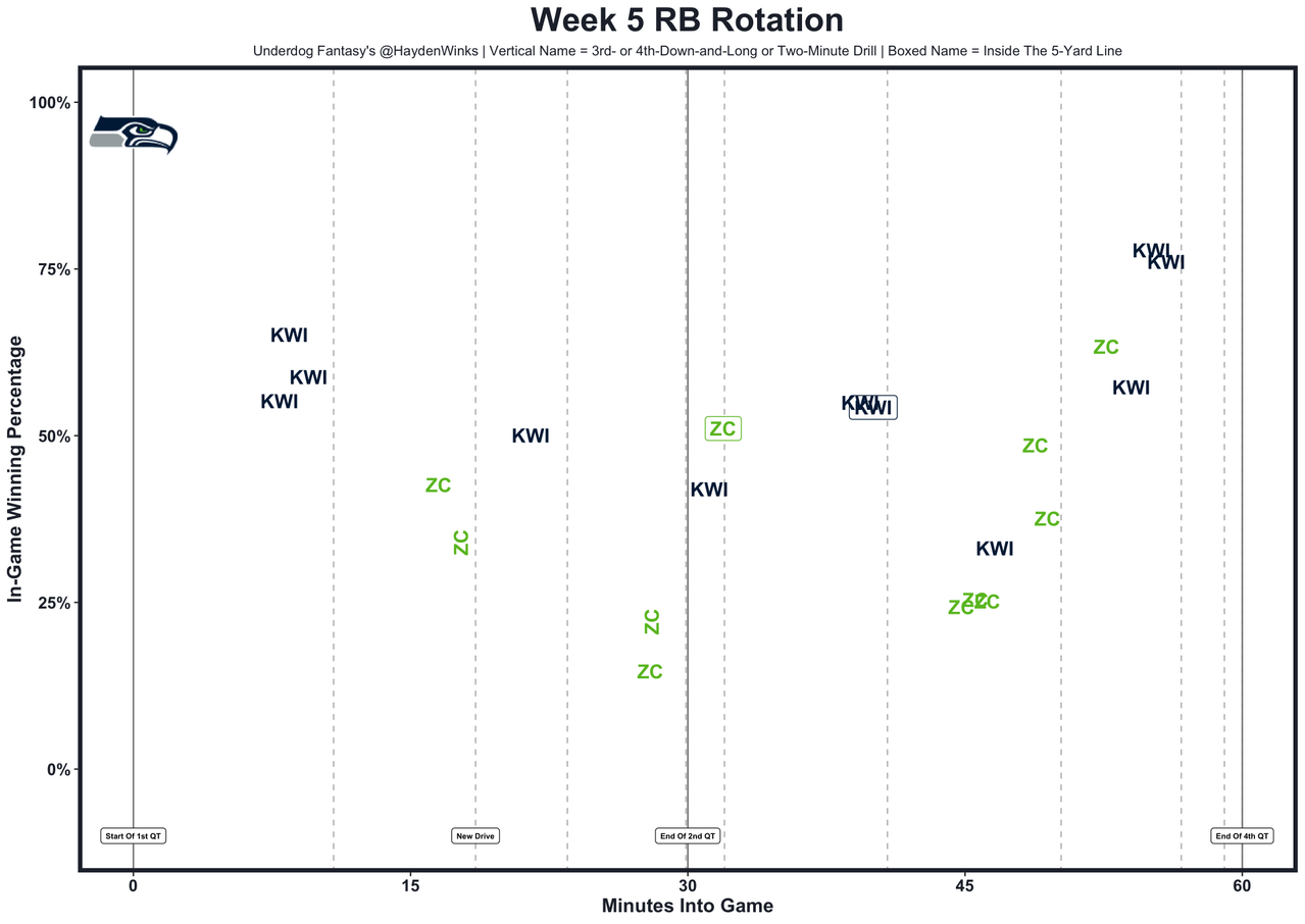 In 4 games with Zach Charbonnet, Walker is averaging 9.6 expected half PPR points (RB27 usage). He's been electric with the ball in his hands and has had some unlucky circumstances that's led to Charbonnet goal-line scores. That should even out over time, assuming they want to continue with this 1-2 punch instead of leaning into the Walker efficiency bump. The Seahawks have a league-average 23.0-point team total in Jacksonville. It's unclear if EDGE Travon Walker (wrist) will return, but he's one of the best rushing defender when healthy.