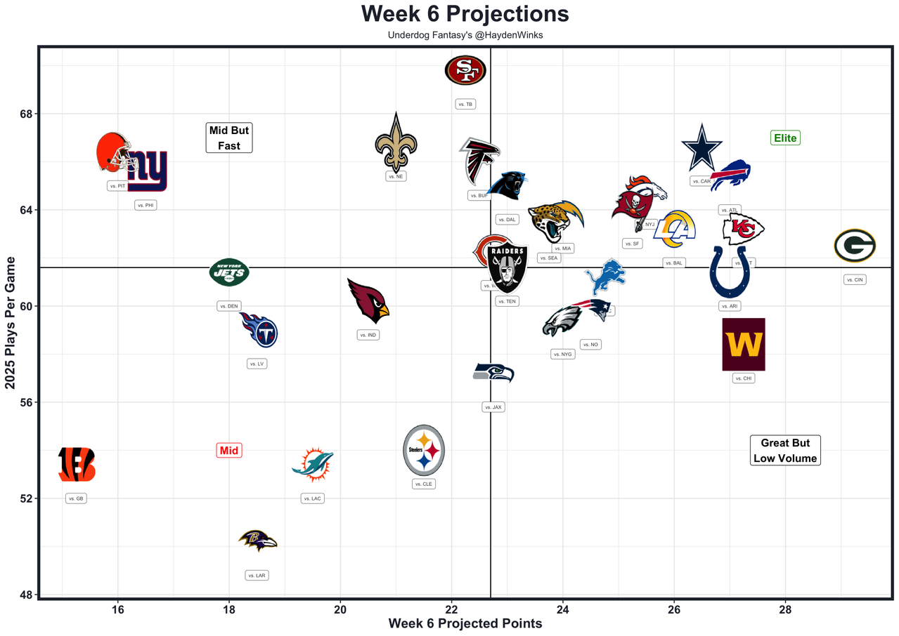 The Patriots have the 10th-most projected points (24.75) at NO, who don't have CB Isaac Yiadom and maybe not EDGE Chase Young again. Maye is 8th in carries this year but just 13th in rushing yards despite being a great athlete. There's room for a fantasy take-off with Stefon Diggs bringing juice to the receiver room (and potentially Kyle Williams down the line). The floor of the offense is high with how well Maye is playing in the pocket and how calm OC Josh McDaniels has called the offense. This team also schemes up things on a week-by-week basis, and the Saints can be pretty static under DC Brandon Staley.
