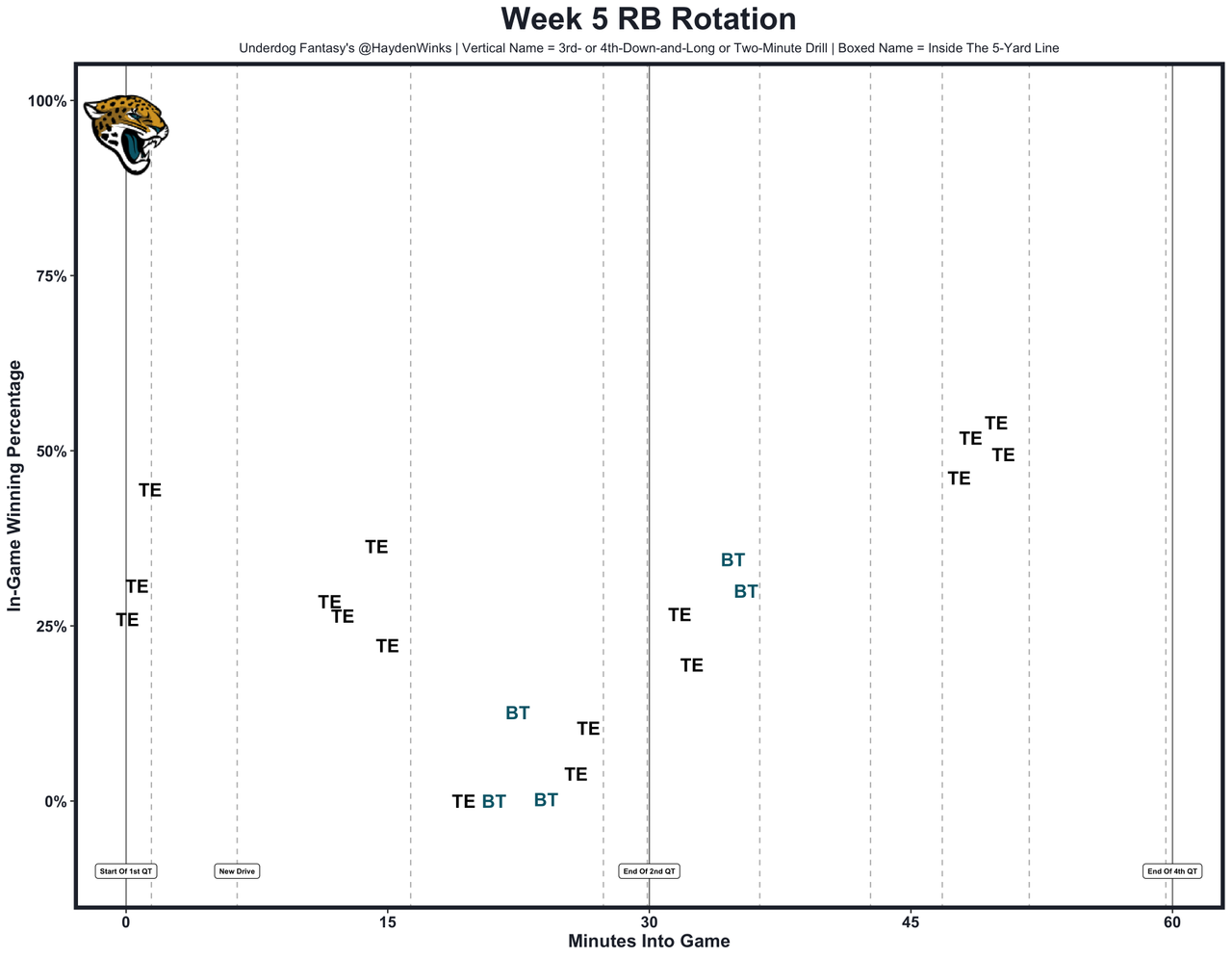 The Seahawks are 2nd-best in average tackle depth on RB carries, but the Jaguars are still projected for 24.5 points at home with the offense continuously moving the chains despite predictable mistakes. Etienne has stood out on tape, improving his decisiveness and explosiveness as a rusher. He's hitting cutback lanes in a more complex rushing and screen system. He's the RB19 on RB18 usage this month, not including his career-best game in Week 1. Meanwhile, Bhayshul Tuten is making some mistakes while flashing athleticism as his distant backup.