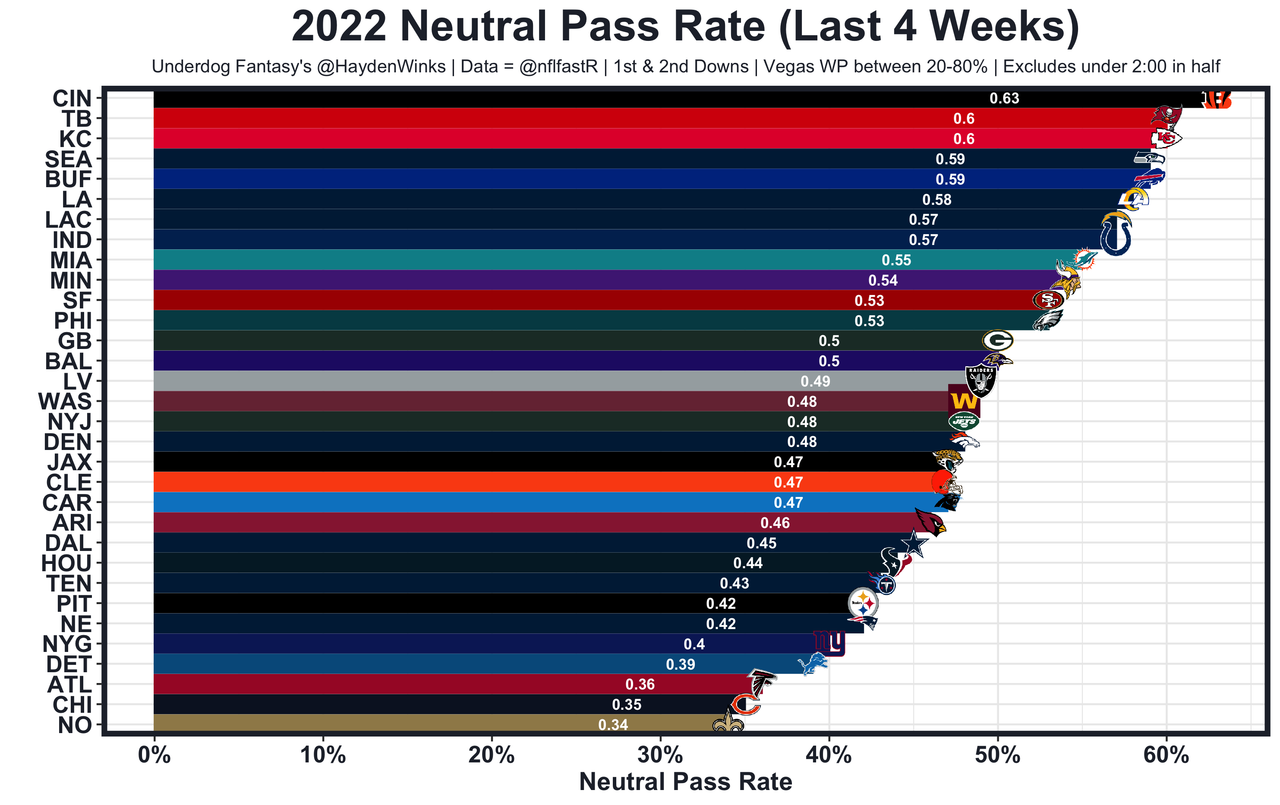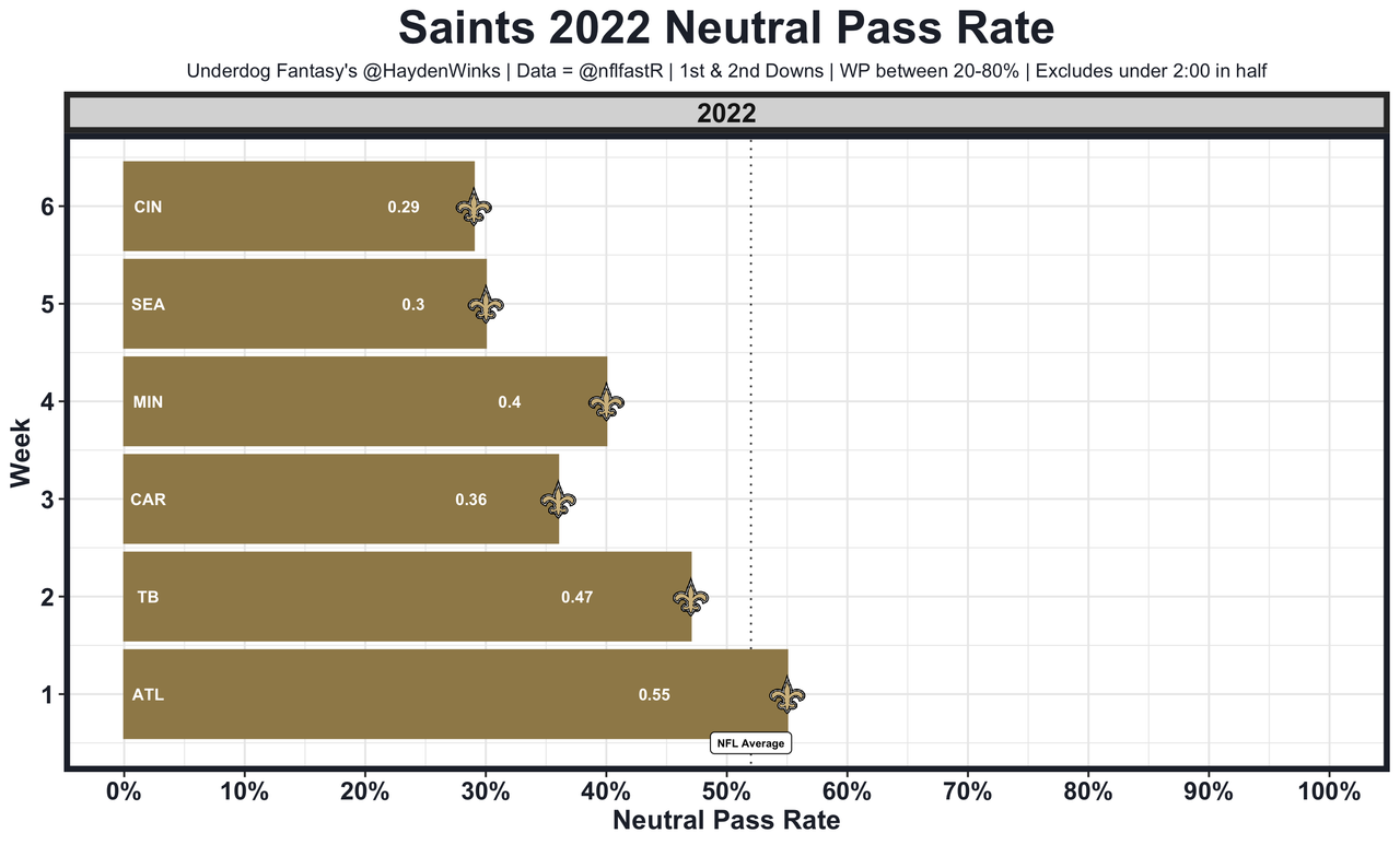 With the receivers hurt (Chris Olave returns this week) and with Andy Dalton under center, the Saints have become the league's most run-heavy offense over the last four weeks. If Dalton starts here, there will be more of a lean on underneath passes, too.