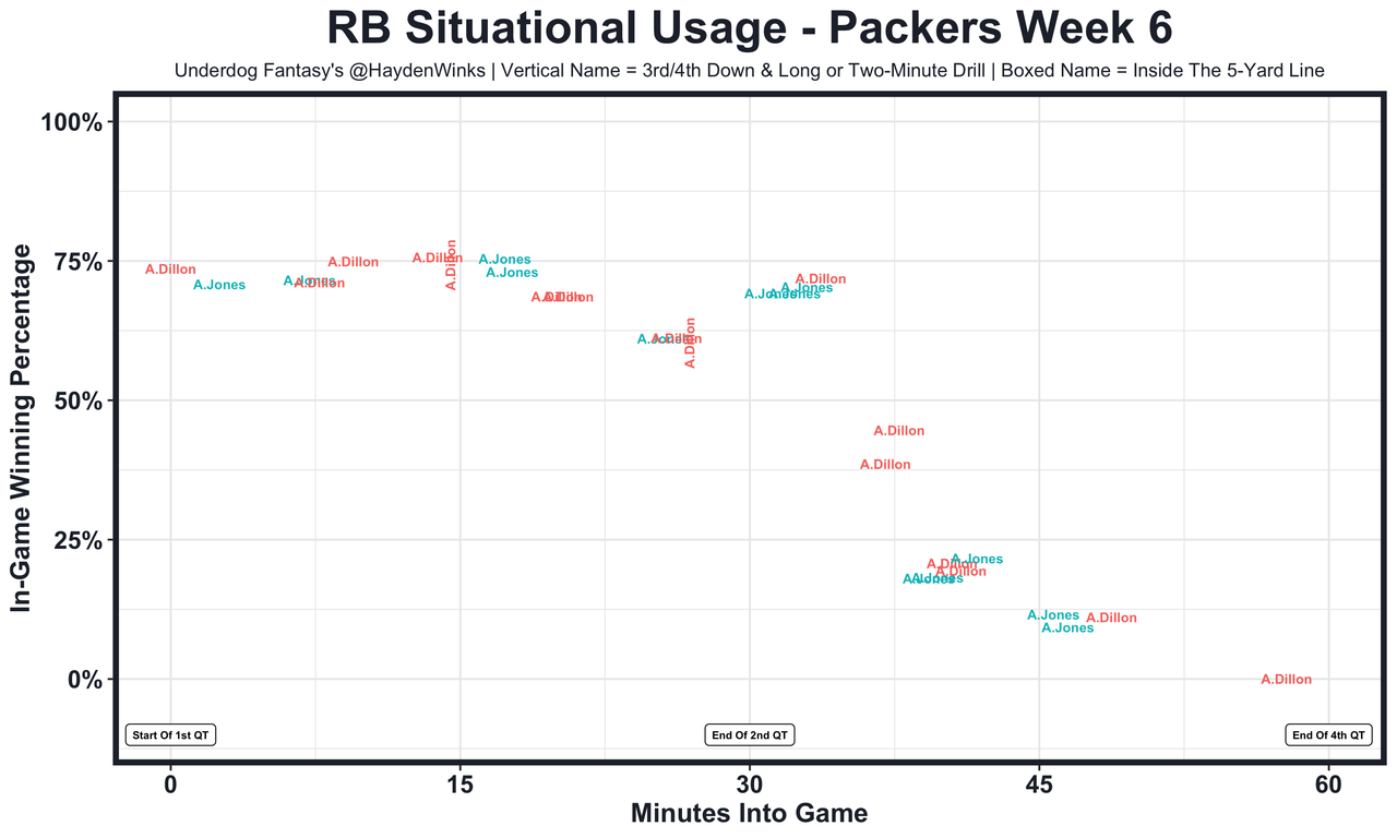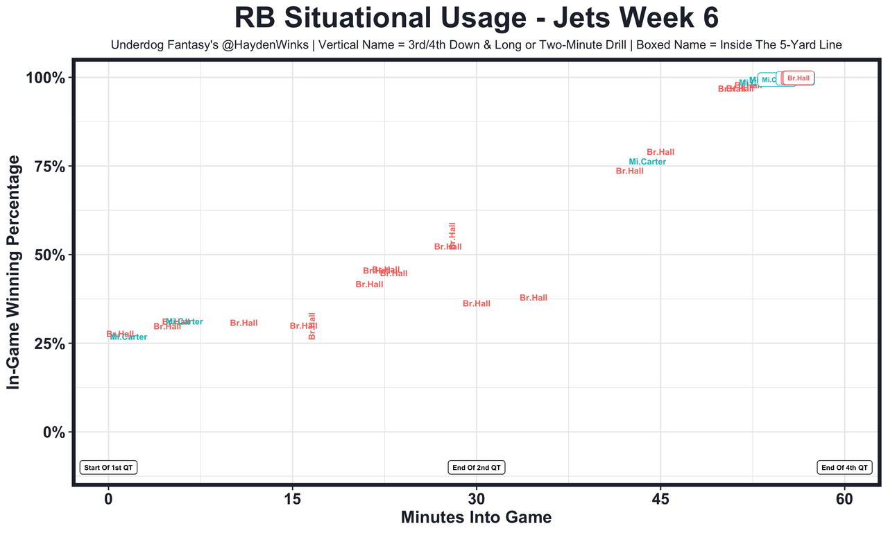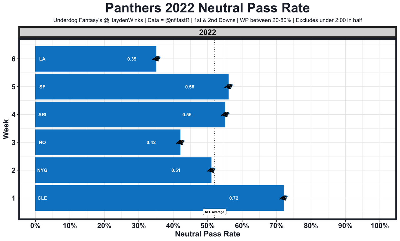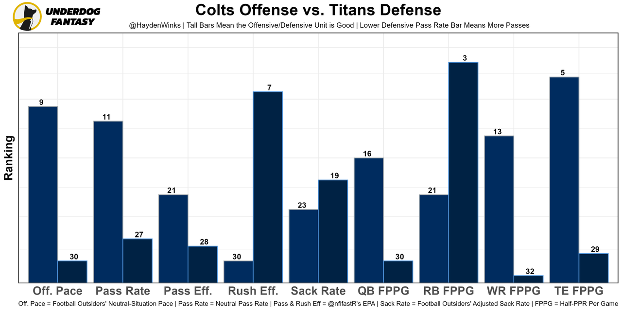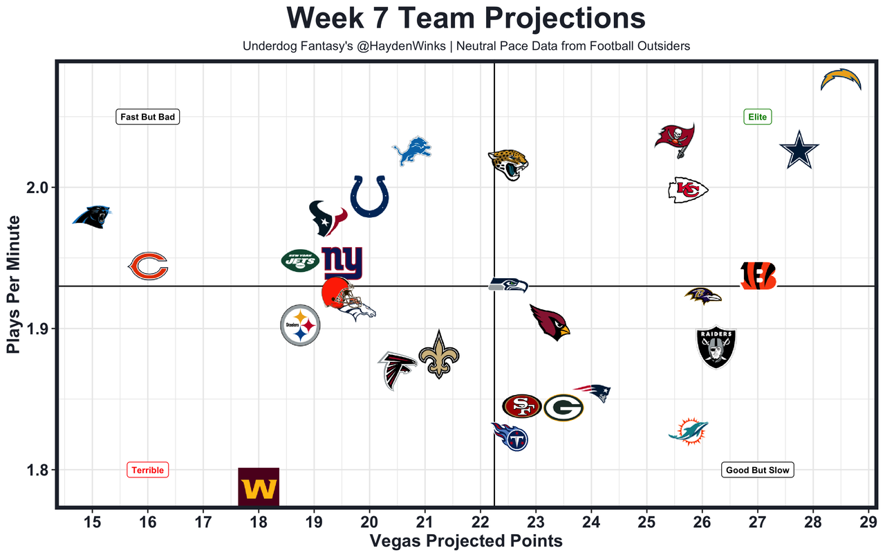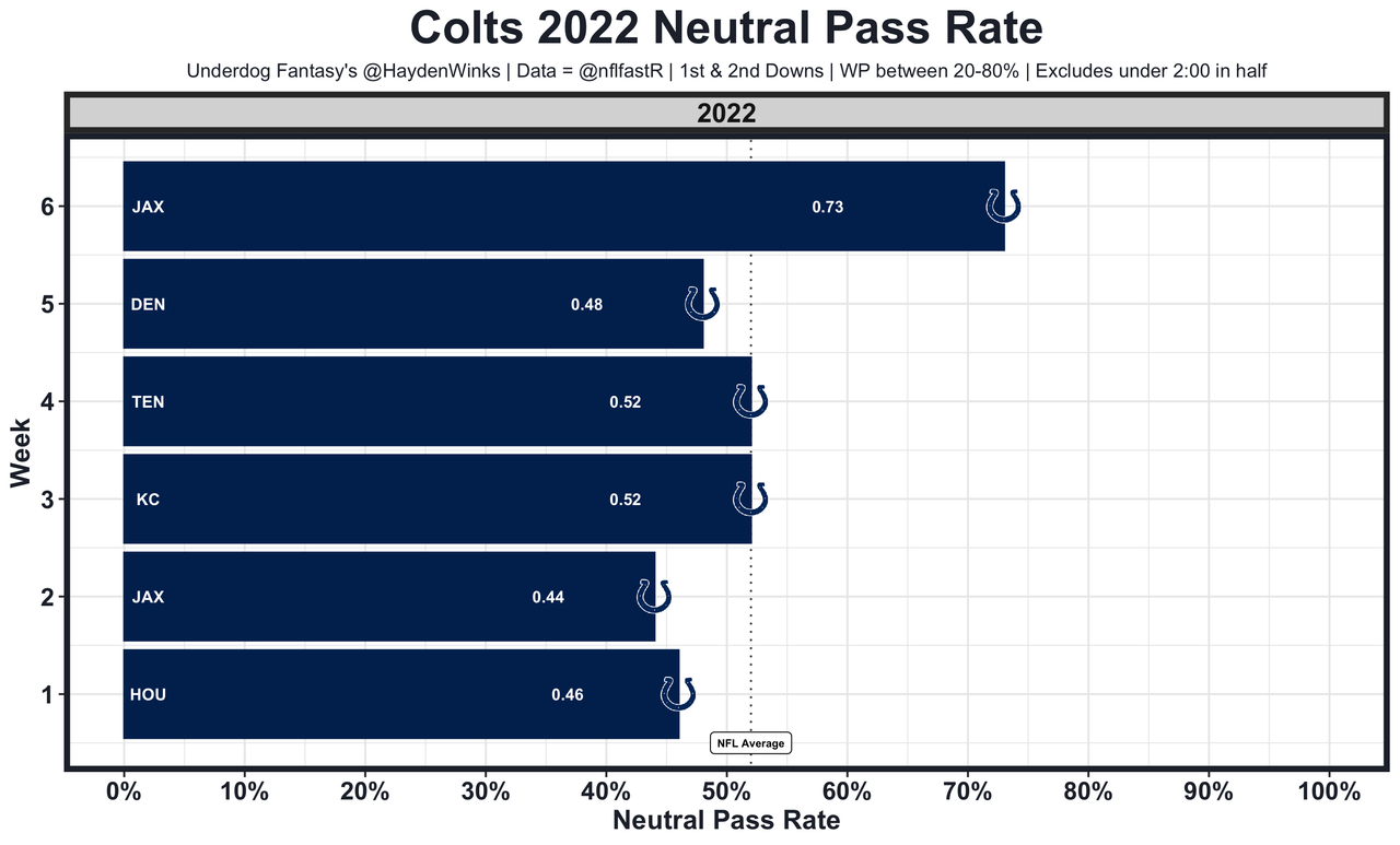 The Colts' Week 6 game plan was probably the most shocking of any game this season, shifting from unwatchable play in Week 5 to a 73% neutral pass rate. With Jonathan Taylor and Nyheim Hines likely back, this likely won't hold, but it was nice to see Matt Ryan bounce back with accurate underneath throws.