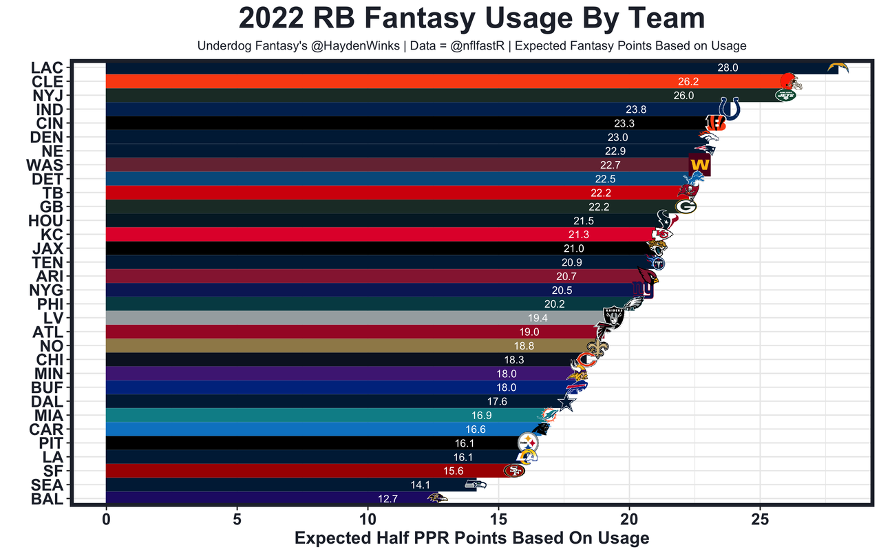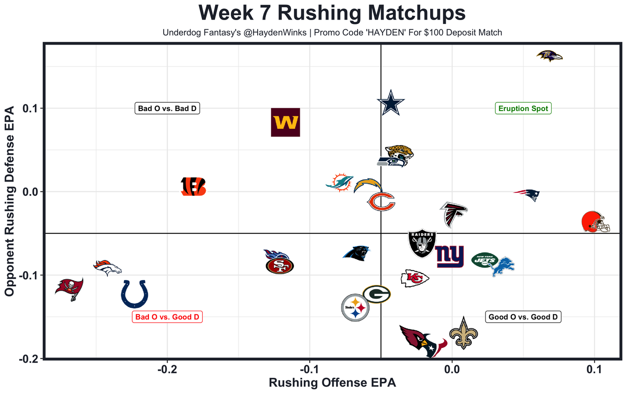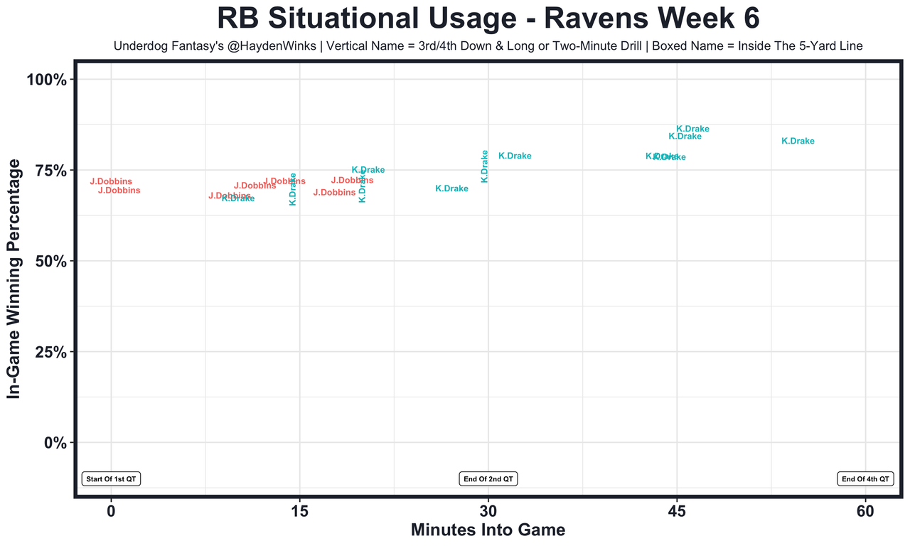 Kenyan Drake - Dobbins (IR) is out weeks. Also, the Browns are dead last in rushing EPA allowed and 30th versus fantasy RBs. Of note, Justice Hill returned to practice, though I found this from The Athletic’s Jeff Zrebiec: “Probably Drake with Justice Hill mixed in. And then I'll stick with hot hand in second half.”
