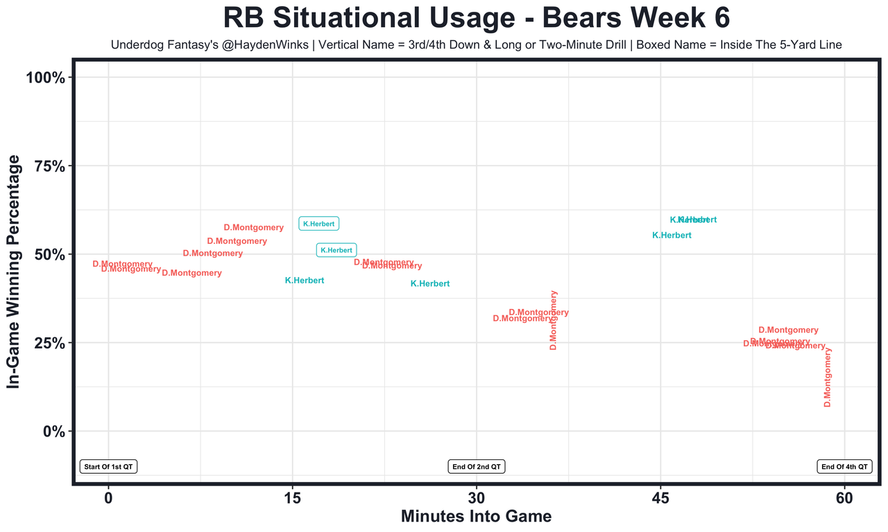 David Montgomery - Khalil Herbert is 1st in rushing yards over expected per NextGenStats, so the Bears coaches said they'll ride the hot hand more often moving forward. Last week, Montgomery had his 2-for-1 drive rotation over Hebert, but now there's more uncertainty. To be fair, Montgomery also has positive rushing yards over expected per NGS. Both are quality backs in my opinion, and with the offensive design, there's enough room to see both operate with a baker's dozen opportunities worst case.