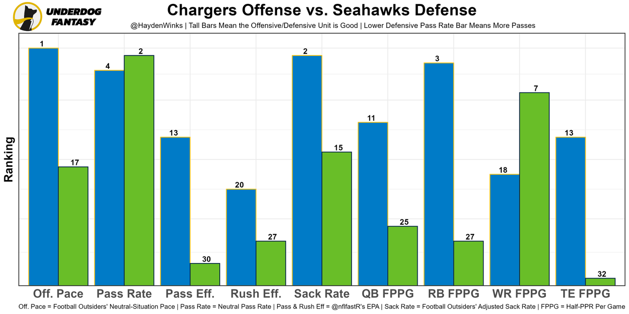 Chargers are tied with the highest team total (27.75 points) of the week, despite their injuries on offense. Keenan Allen (limited x3) is truly questionable. Joshua Palmer (concussion), Joshua Kelley (knee), and Donald Parham (concussion) are out.