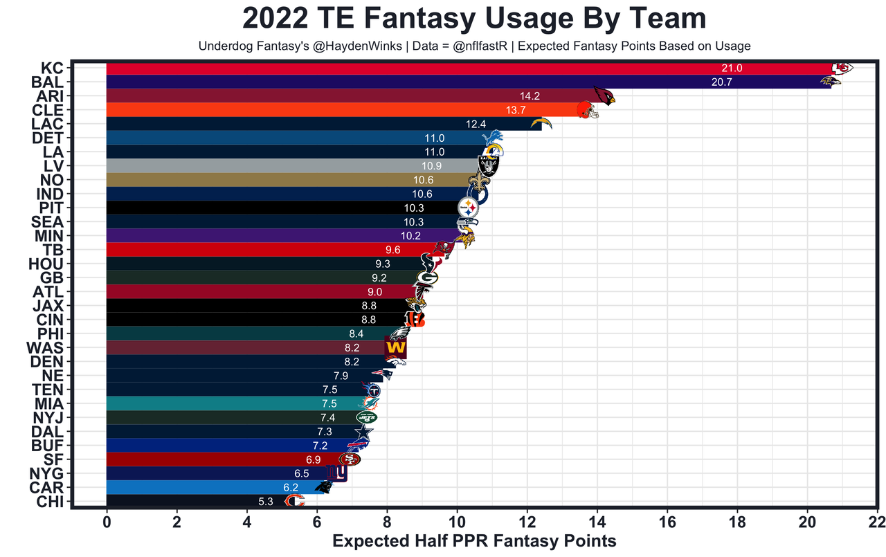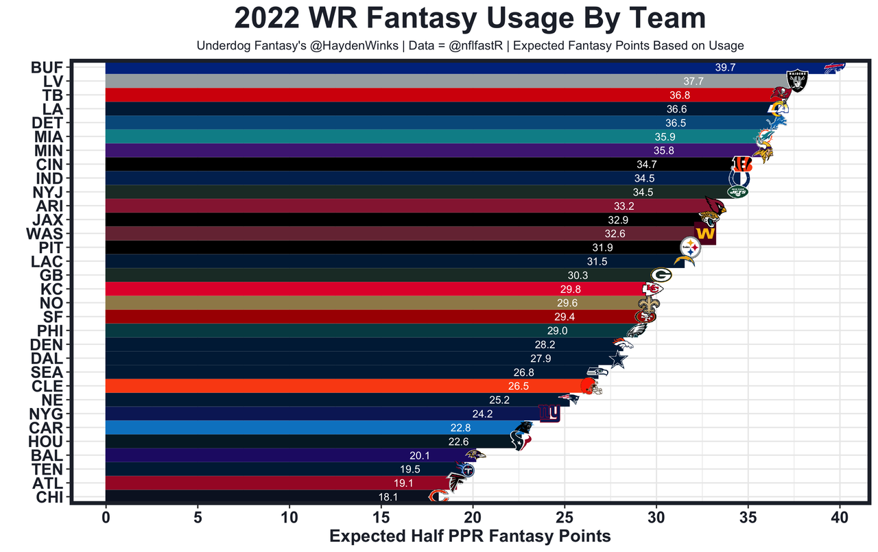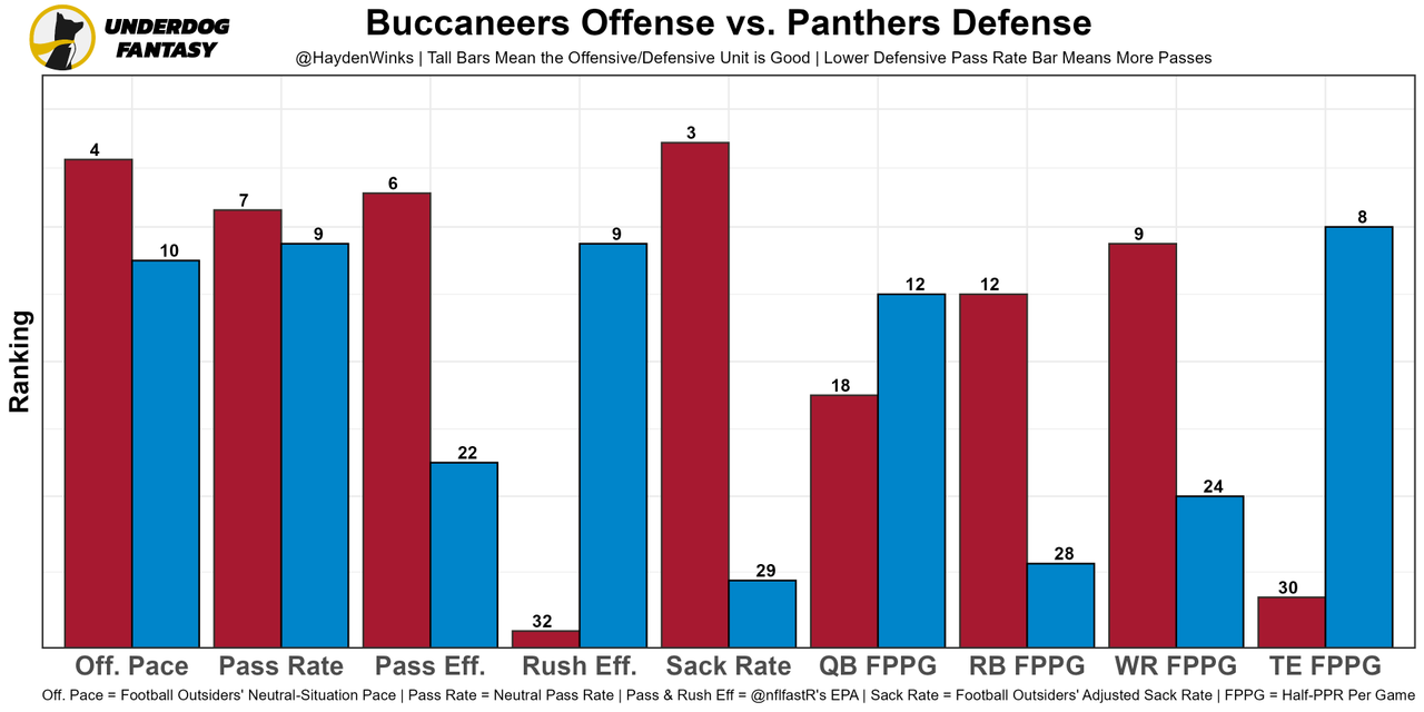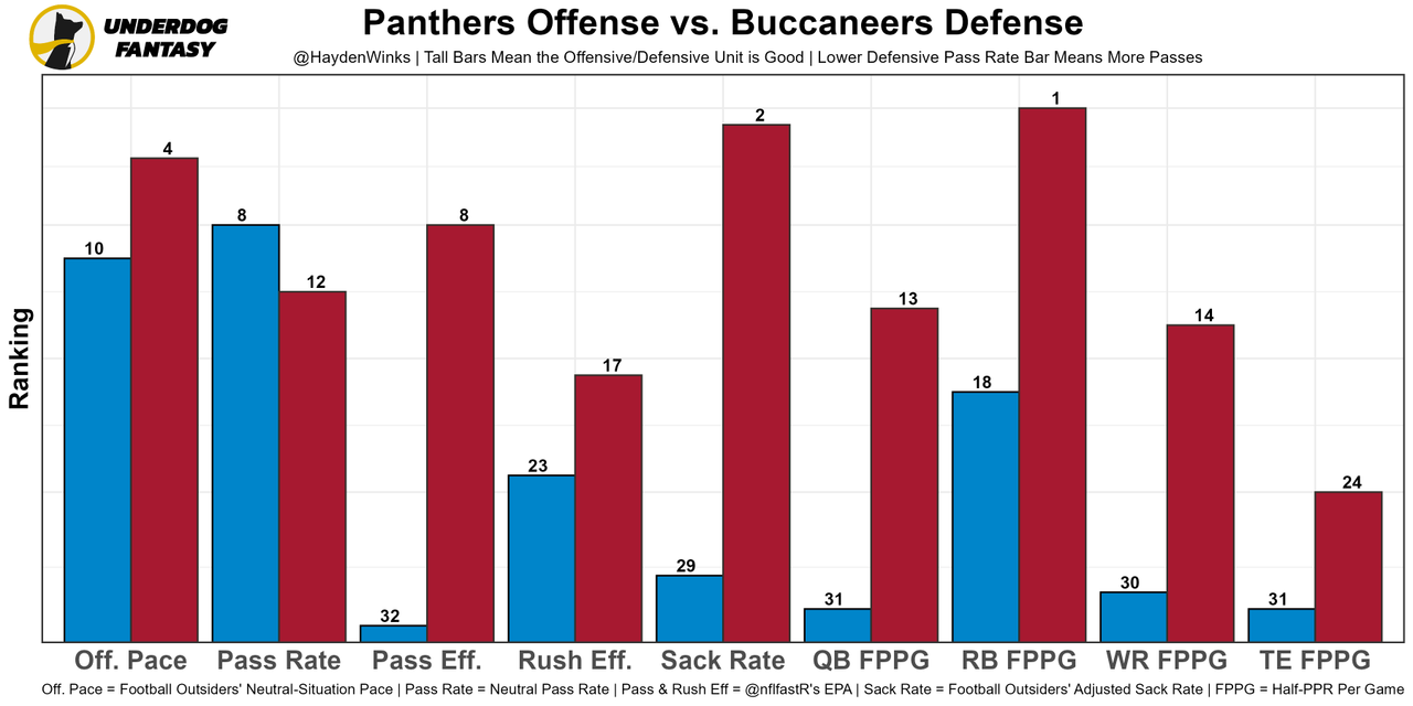 Chuba Hubbard - Hubbard is likely viewed as the better passing down option (and perhaps has more long-term value), while Foreman has out-carried Hubbard this season, 12-to-6. The team will be trailing heavily most games, so Hubbard has some deep sicko-league PPR flex value. Foreman is more likely to score a TD on the ground. Of course, there aren't many TDs available with the Panthers projected for .... wait for it .... 13.0 points this week.