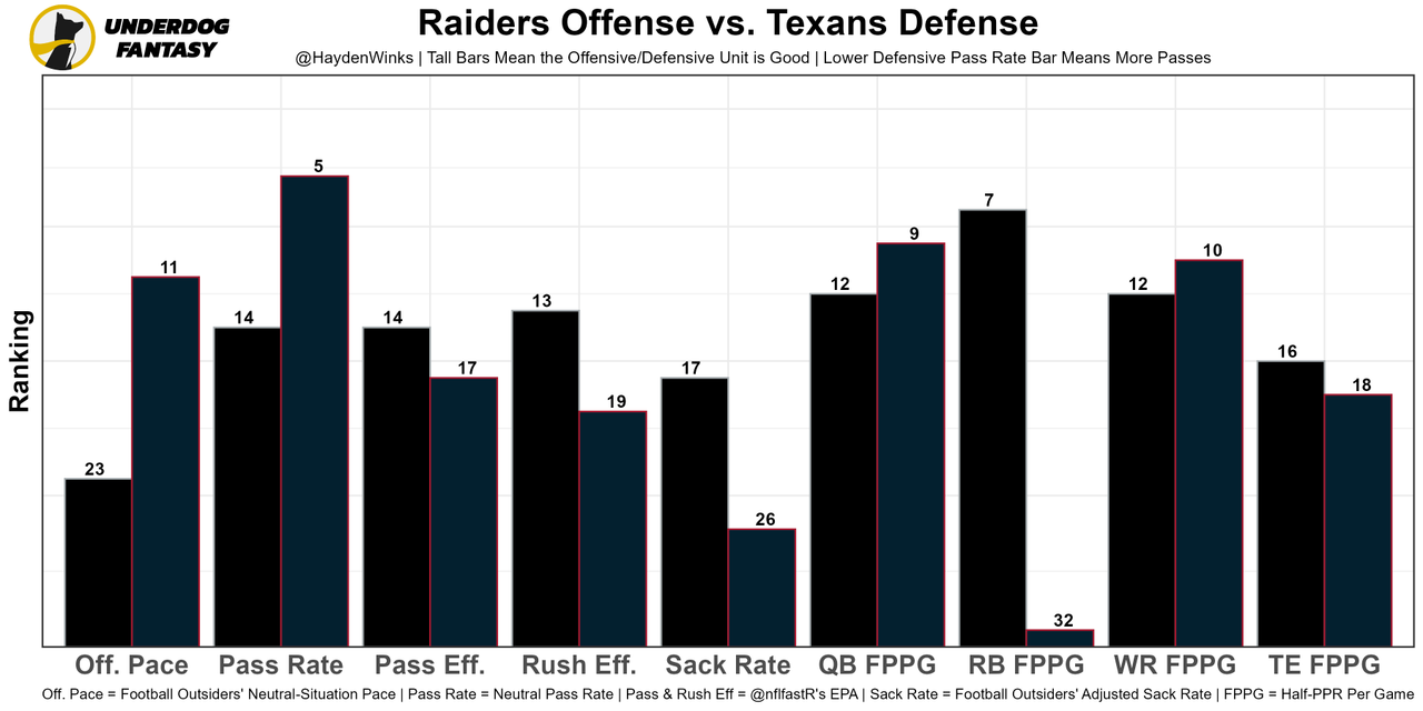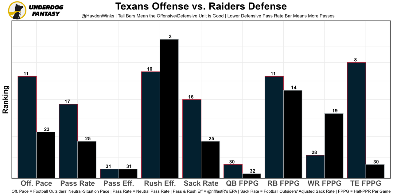 The Texans best pass rusher (Jonathan Greenard) is out. This assumes Hunter Renfrow plays with Darren Waller out.
