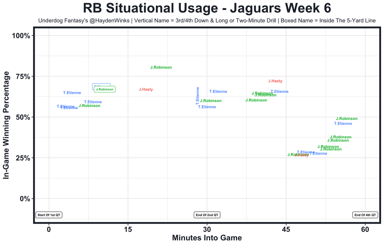 Travis Etienne - He started for the first time last week, and JRob's efficiency has tanked since Week 3. Jacksonville should keep giving Etienne more looks.