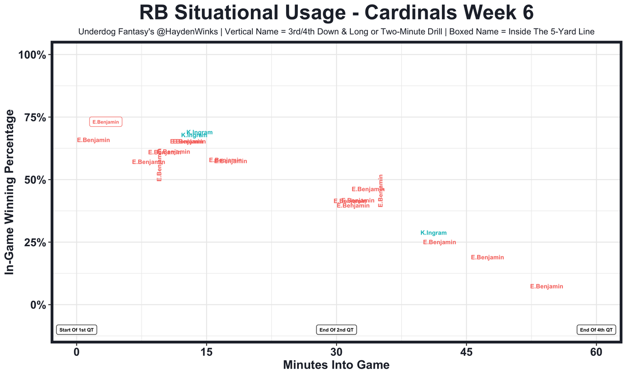 Eno Benjamin - This assumes James Conner (DNP Wednesday) is out. Benjamin was in a mini bellcow role in Week 6. The issue is that Benjamin could be less of a focal point at the goal line, and that the Cardinals may not get to the goal line as often with LG Justin Pugh and C Rodney Hudson hurt.