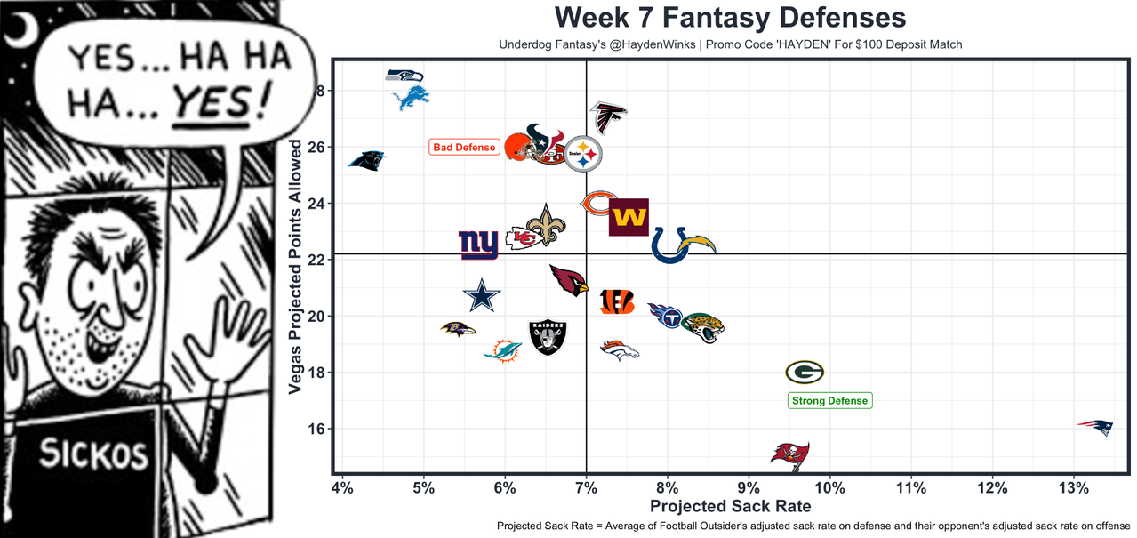 The defenses of the week are the Patriots, Bucs, and Packers, with the Broncos, Jaguars, Jets, Titans, and Bengals also in play.