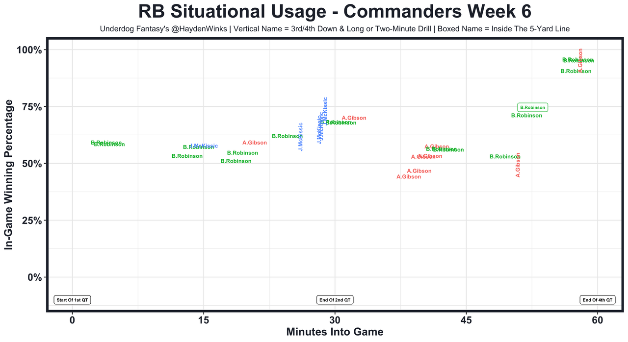 Brian Robinson - He's the primary runner and goal line back, while Antonio Gibson spells him and J.D. McKissic handles all passing work. It's not sexy work, but he can fart into a touchdown, just at lower odds of other early-down RBs given this offense.