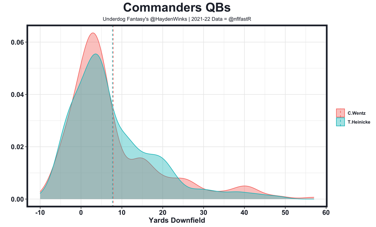 This isn't a huge downgrade at QB in general, but Heinicke is more likely to scramble than pass, so it's a negative for the fantasy appeal altogether. Last year, Heinicke passed in the intermediate areas more often and went for the long ball less often compared to Carson Wentz. There are too many mouths to feed for a team projected for 18.25 points.