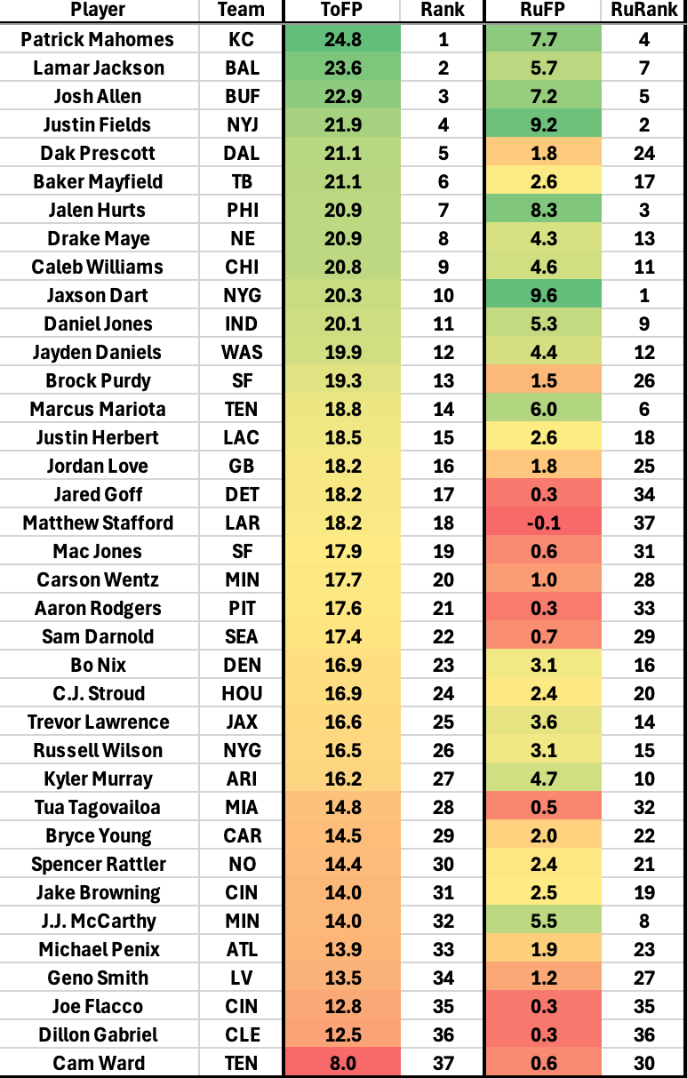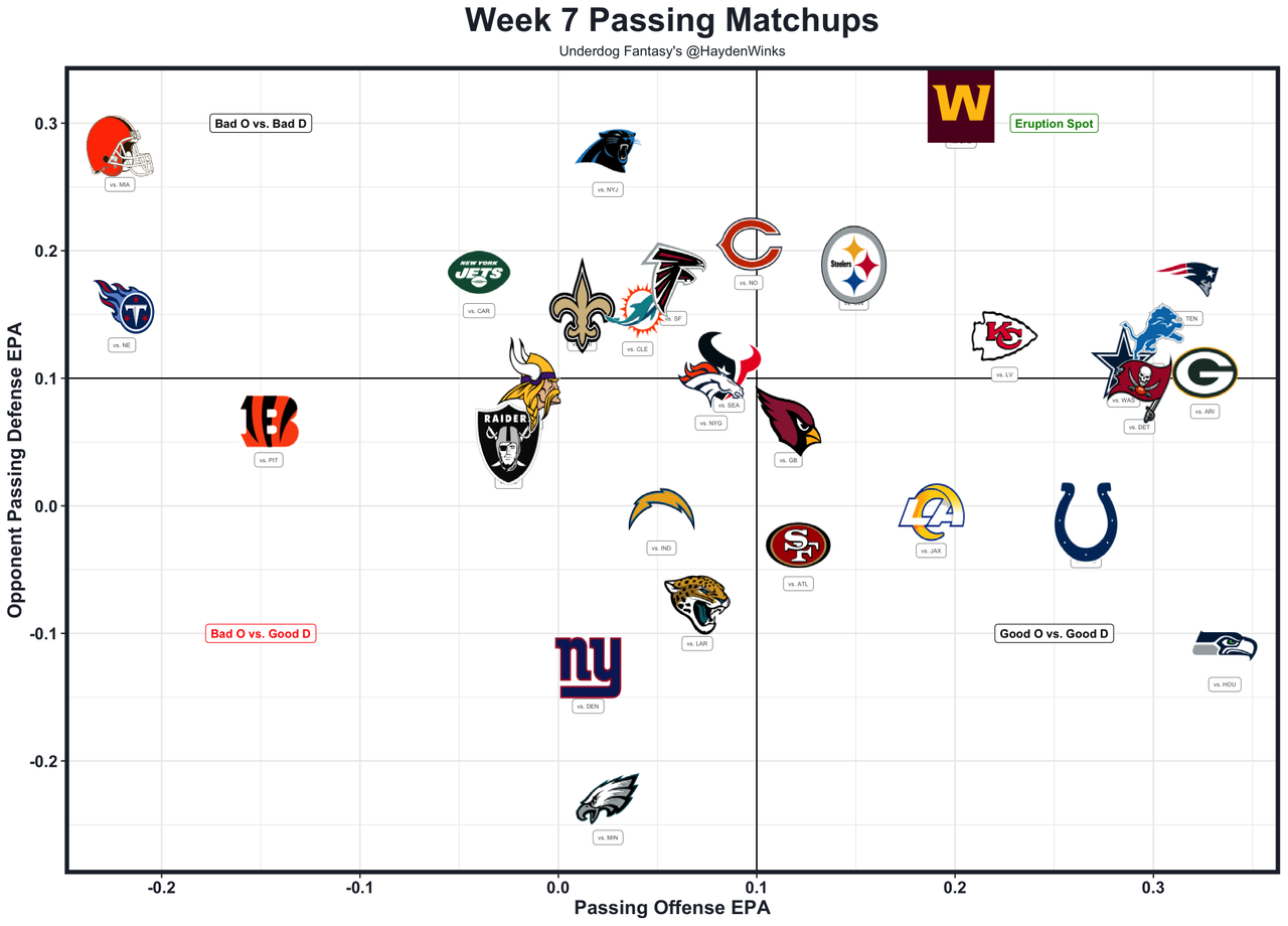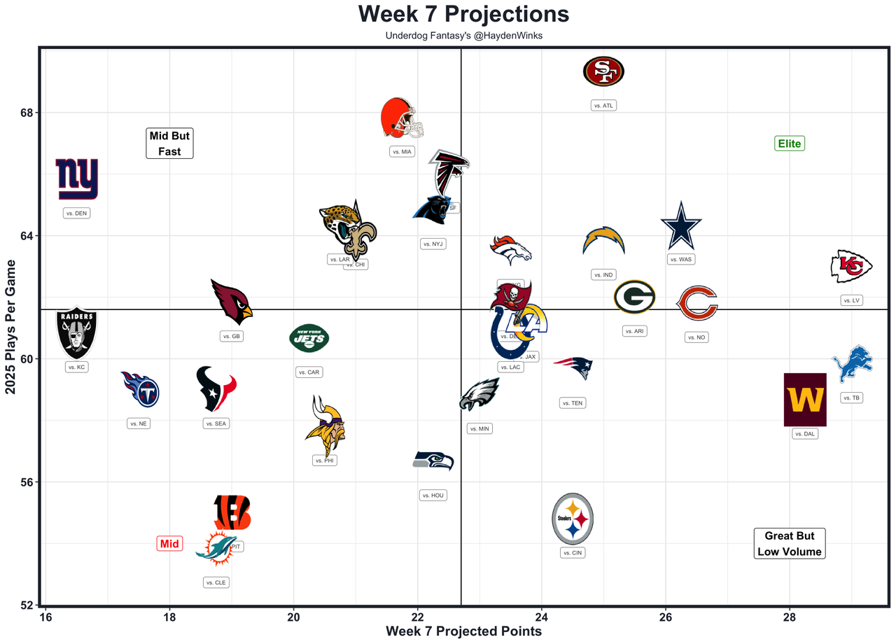 The Patriots are 7th in projected points (24.75) at TEN. This is an eruption spot per the passing EPA chart, and this feels like a spot where coach Mike Vrabel wants to put it on. Maye is already the QB8 in fantasy this year and is starting to get real production from Stefon Diggs now.