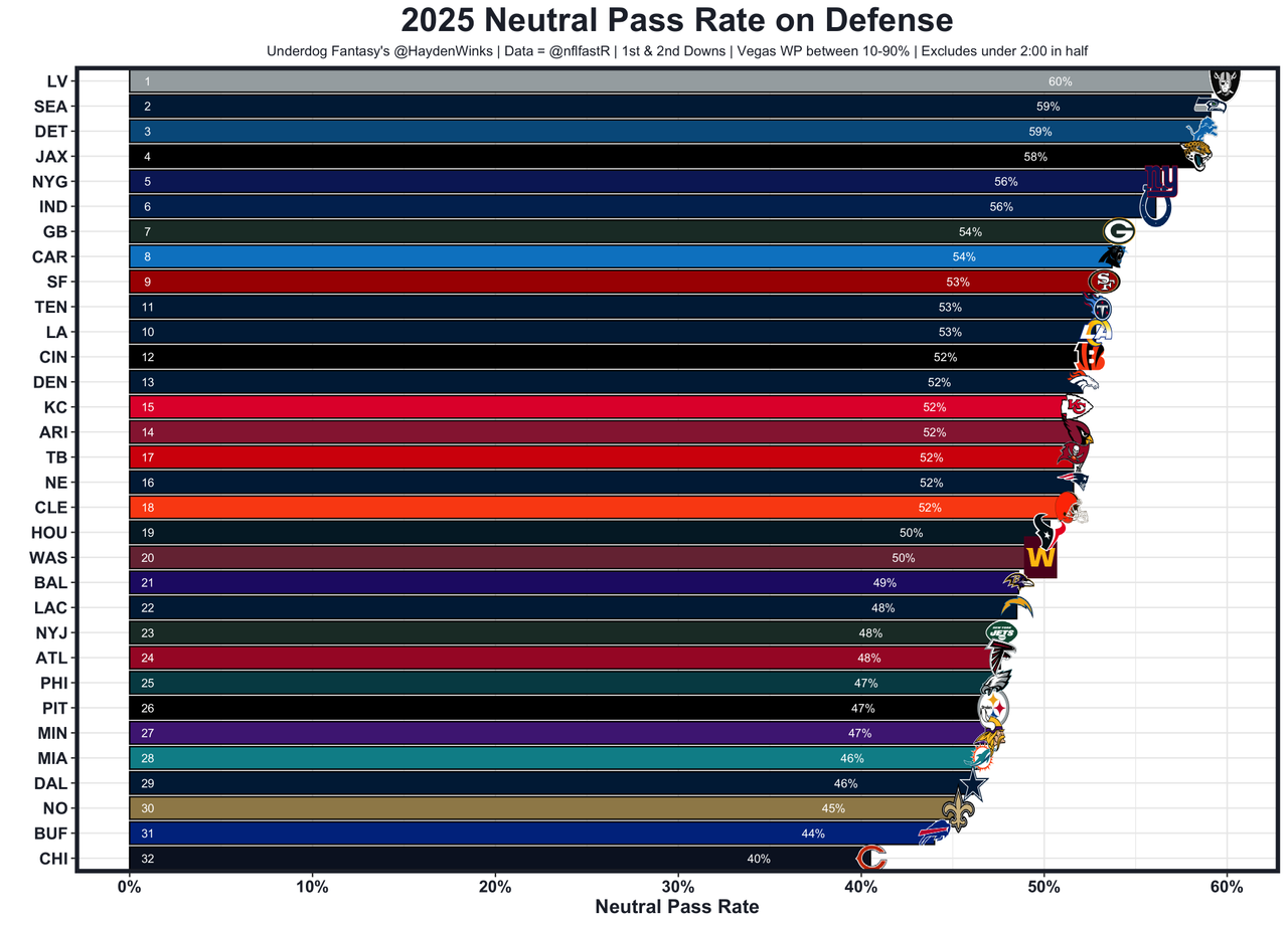 The Lions are 1st in projected points (29.0) vs. TB, who are generally a good but pass funnel defense. He's been the QB17 despite Detroit averaging 31 points per game this year. The main difference is this year's team is running the ball even more than last year. They've been bottom-3 in neutral pass rate all year.