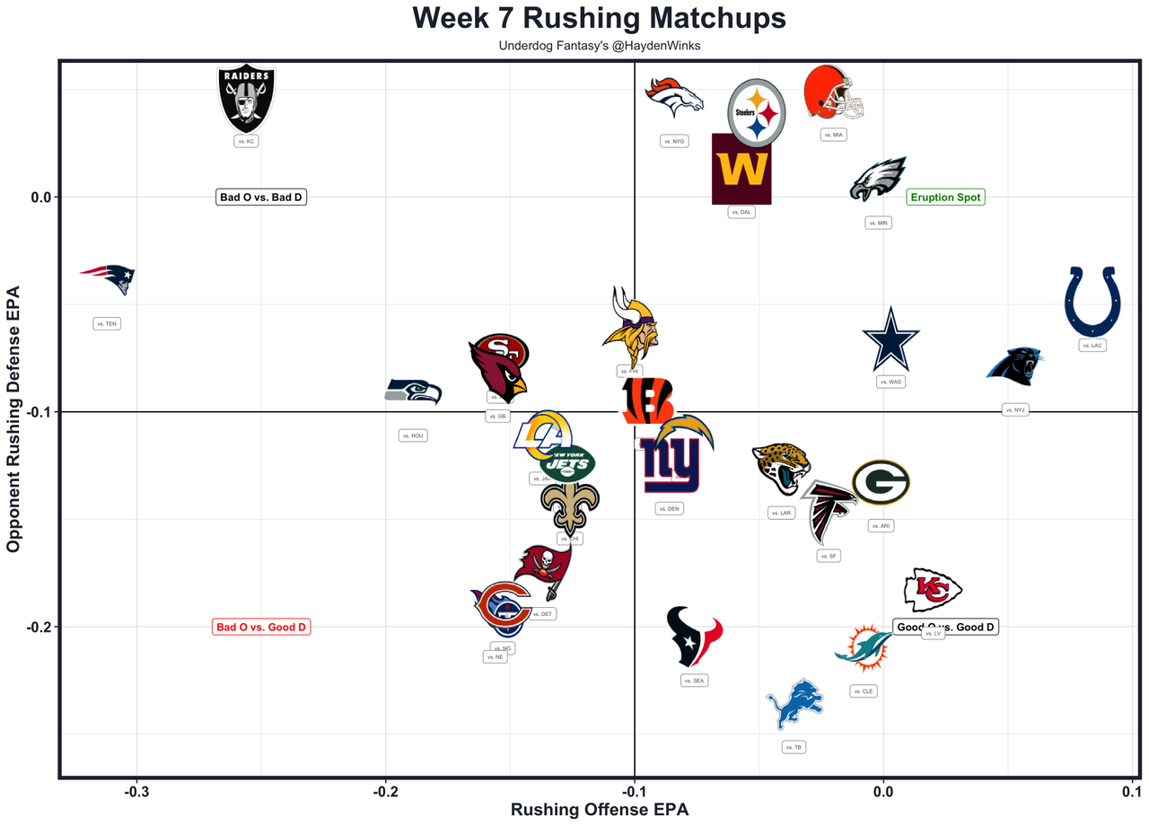 This is an eruption spot per the rushing EPA chart and all of our eye balls. The Cowboys stink, and the Commanders are 3rd in projected points (28.5). The early-down RB has 29.7 (Josh Jacobs), 17.5 (Breece Hall), and 31.9 half PPR points (Rico Dowdle) in recent games.