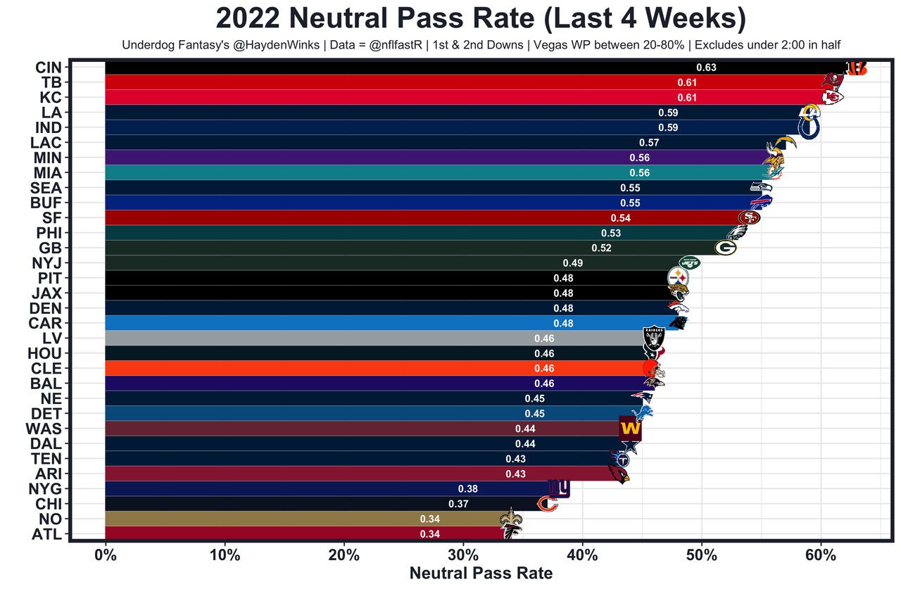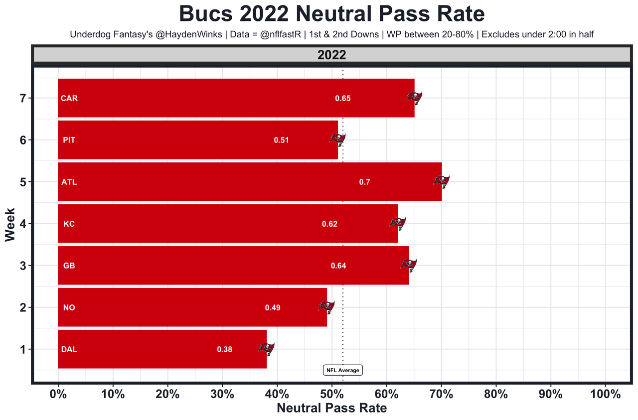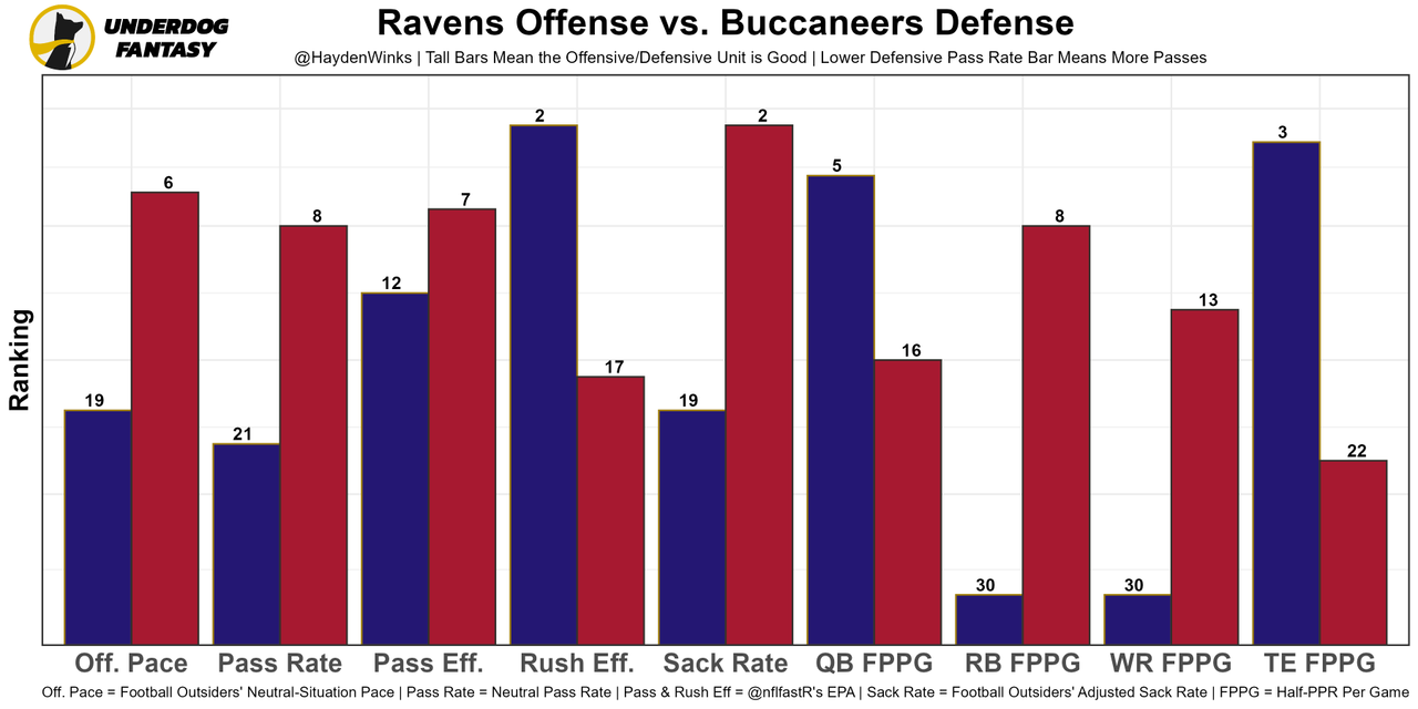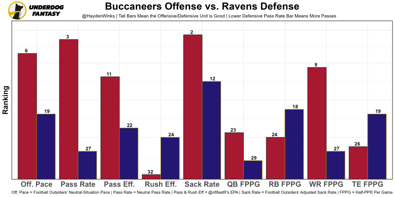 The offense only works when they go pass-happy. This week, they get the Ravens, who have the 6th-highest neutral pass rate allowed on defense. This is aligning to be a volume-based game for Brady through the air, even though the team total is fairly low at 22.25 points.