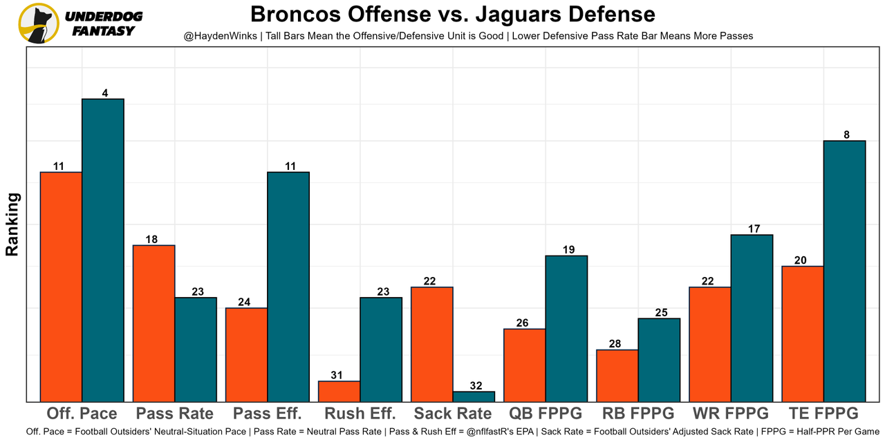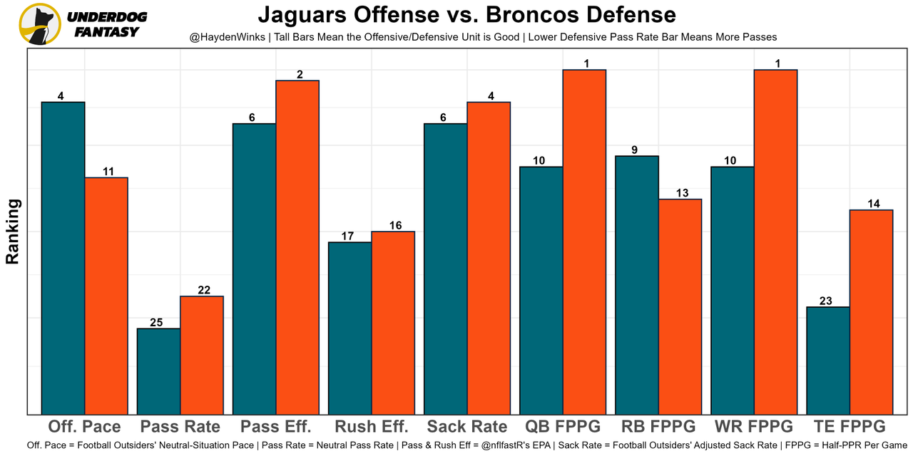 The Broncos defense is No. 1 against fantasy QBs, while leading the NFL in two-high shell coverages. Lawrence will have to dink-and-dunk down the field to be successful and will have his hands full against the simulated pressures that this unit brings. This is a huge task for a young offense.