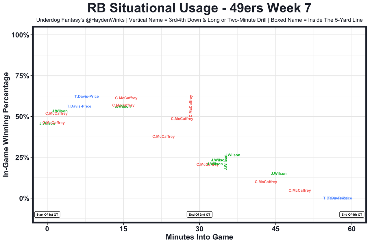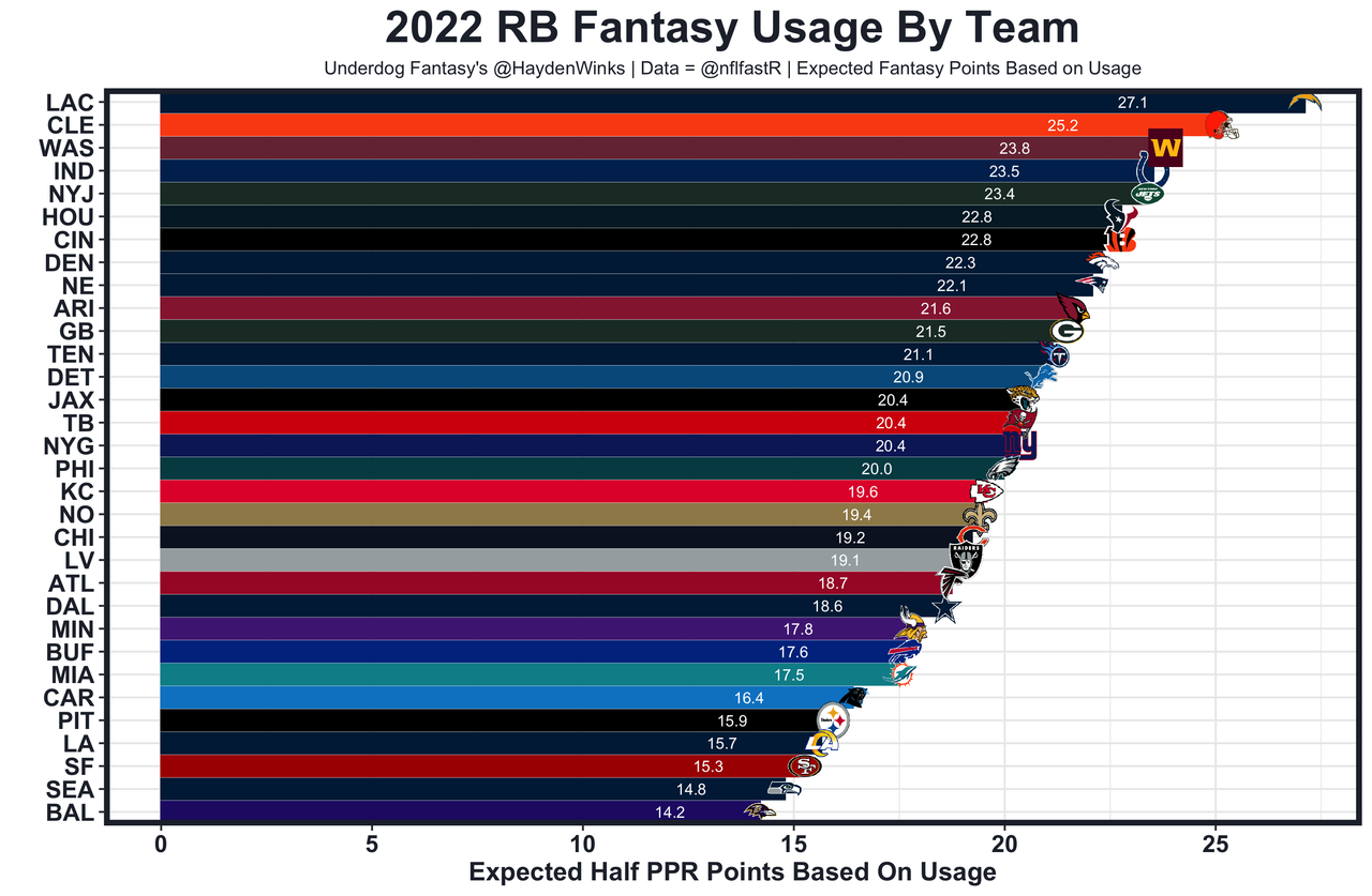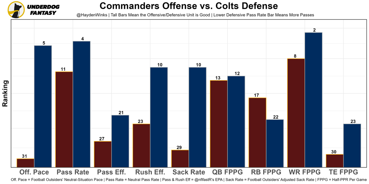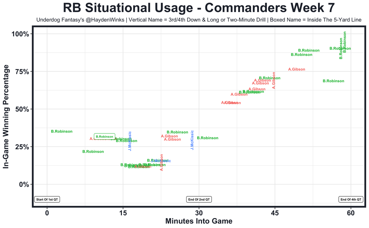Brian Robinson - This is a 3-RB backfield, with J.D. McKissic playing less but still holding down the 2-minute drill and with Antonio Gibson splitting early down work with Robinson. BRob will be game script dependent, which isn't a great sign on the below-average Commanders.