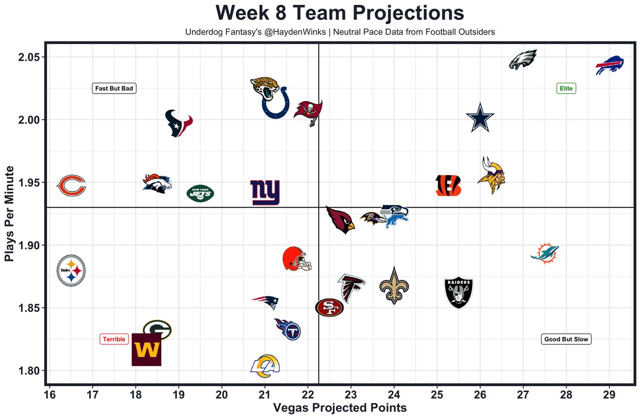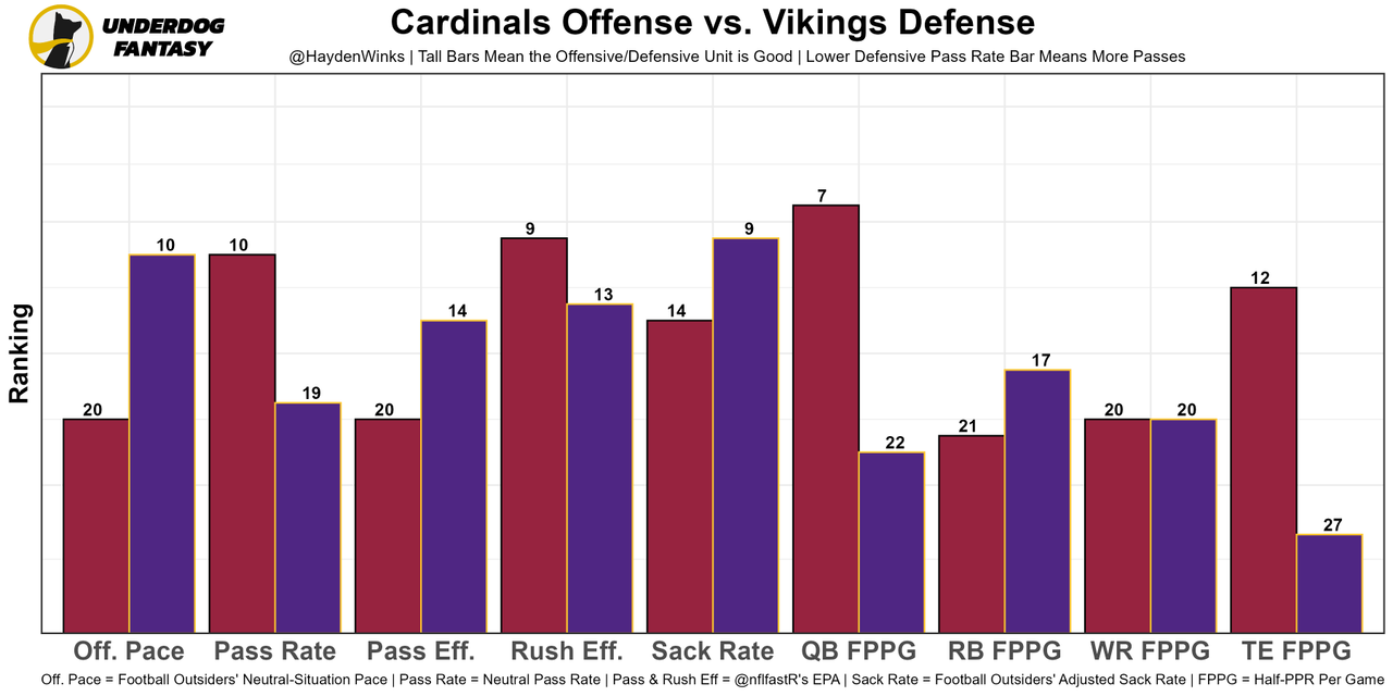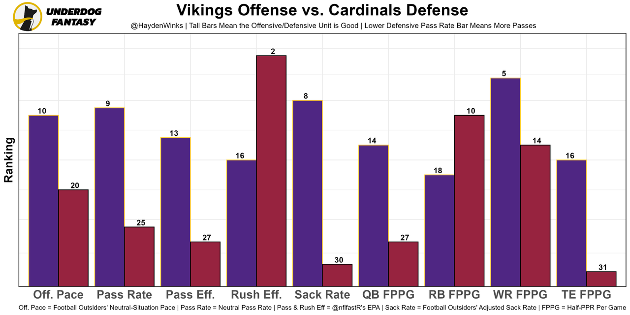 The Vikings are quietly top-10 in neutral pace and neutral pass rate, plus the Cardinals are playing faster on offense in recent weeks. This is a potential shootout spot.
